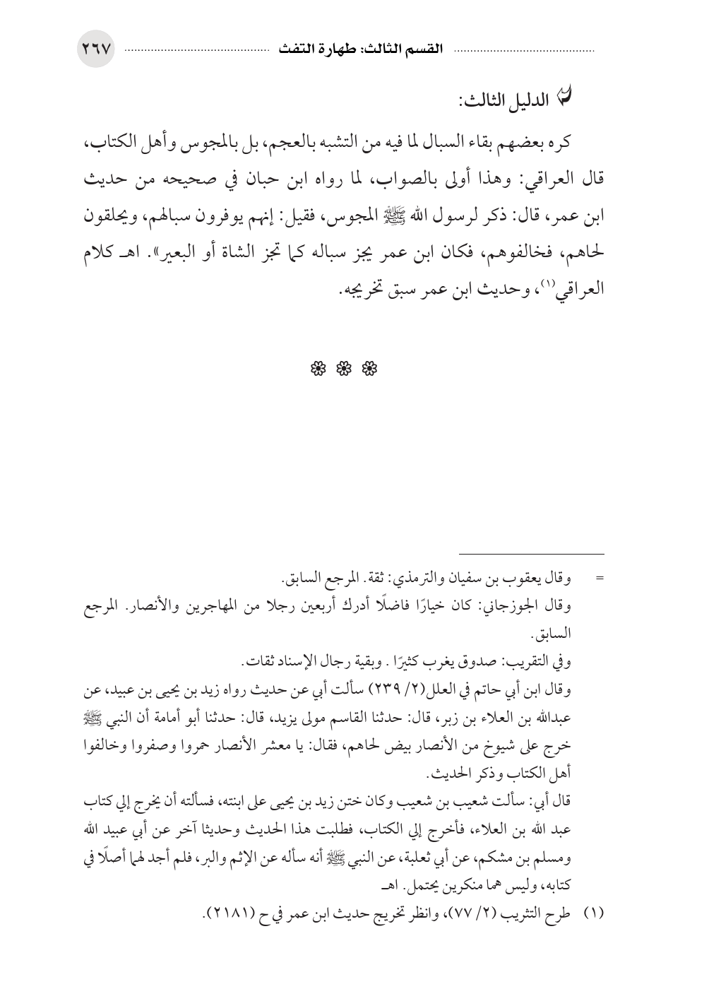 كره بعضهم بقاء السبال لما فيه من التشبه بالعجم، بل بالمجوس وأهل الكتاب، قال العراقي: وهذا أولى بالصواب، لما رواه ابن حبان في صحيحه من حديث ابن عمر، قال: ذكر لرسول الله صلى الله عليه وسلم المجوس، فقيل: إنهم يوفرون سبالهم، ويحلقون لحاهم، فخالفوهم، فكان ابن عمر يجز سباله كما تجز الشاة أو البعير». اهـ كلام العراقي (¬١)، وحديث ابن عمر سبق تخريجه.