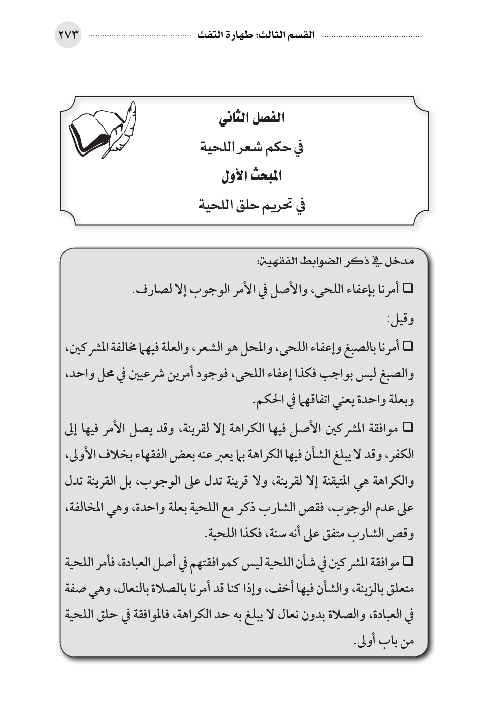 • موافقة المشركين الأصل فيها الكراهة إلا لقرينة، وقد يصل الأمر فيها إلى الكفر، وقد لا يبلغ الشأن فيها الكراهة بما يعبر عنه بعض الفقهاء بخلاف الأولى، والكراهة هي المتيقنة إلا لقرينة، ولا قرينة تدل على الوجوب، بل القرينة تدل على عدم الوجوب، فقص الشارب ذكر مع اللحية بعلة واحدة، وهي المخالفة، وقص الشارب متفق على أنه سنة، فكذا اللحية.
