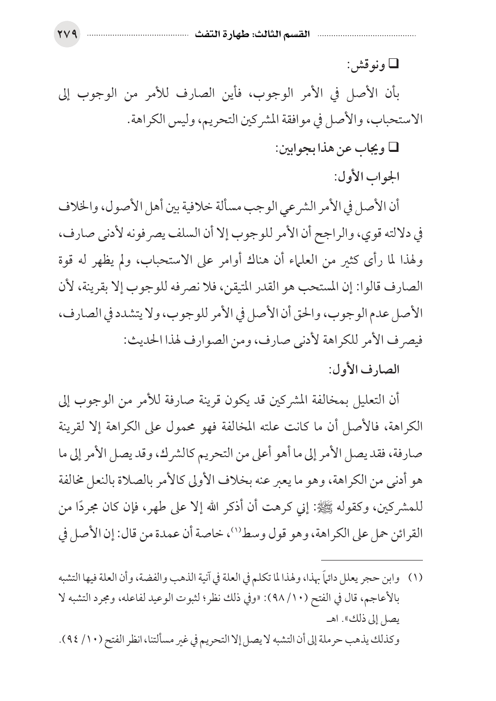 أن التعليل بمخالفة المشركين قد يكون قرينة صارفة للأمر من الوجوب إلى الكراهة، فالأصل أن ما كانت علته المخالفة فهو محمول على الكراهة إلا لقرينة صارفة، فقد يصل الأمر إلى ما أهو أعلى من التحريم كالشرك، وقد يصل الأمر إلى ما هو أدنى من الكراهة، وهو ما يعبر عنه بخلاف الأولى كالأمر بالصلاة بالنعل مخالفة للمشركين، وكقوله صلى الله عليه وسلم: إني كرهت أن أذكر الله إلا على طهر، فإن كان مجردًا من القرائن حمل على الكراهة، وهو قول وسط (¬١)، خاصة أن عمدة من قال: إن الأصل في