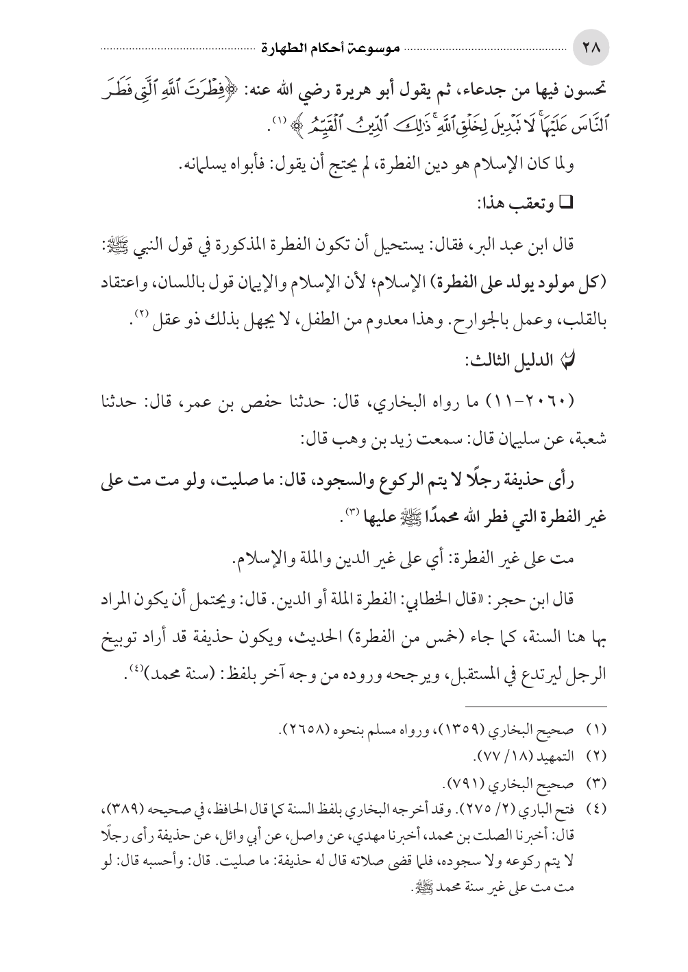قال ابن عبد البر، فقال: يستحيل أن تكون الفطرة المذكورة في قول النبي صلى الله عليه وسلم: (كل مولود يولد على الفطرة) الإسلام؛ لأن الإسلام والإيمان قول باللسان، واعتقاد بالقلب، وعمل بالجوارح. وهذا معدوم من الطفل، لا يجهل بذلك ذو عقل (¬٢).