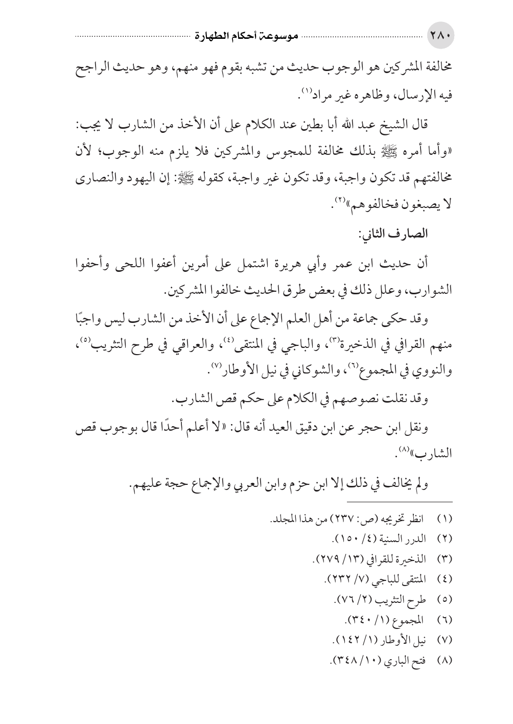 ونقل ابن حجر عن ابن دقيق العيد أنه قال: «لا أعلم أحدًا قال بوجوب قص الشارب» (¬٨).