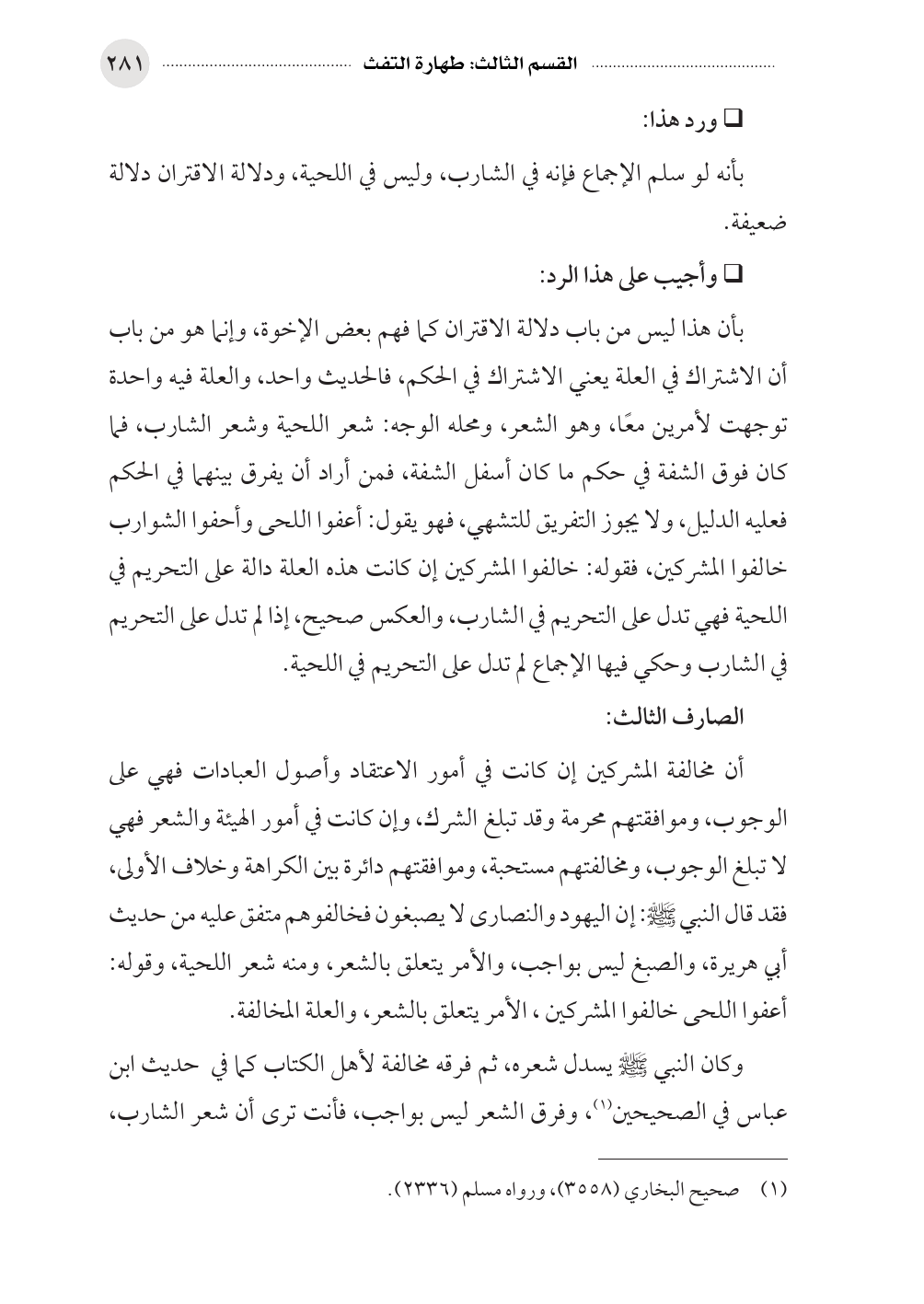 بأن هذا ليس من باب دلالة الاقتران كما فهم بعض الإخوة، وإنما هو من باب أن الاشتراك في العلة يعني الاشتراك في الحكم، فالحديث واحد، والعلة فيه واحدة توجهت لأمرين معًا، وهو الشعر، ومحله الوجه: شعر اللحية وشعر الشارب، فما كان فوق الشفة في حكم ما كان أسفل الشفة، فمن أراد أن يفرق بينهما في الحكم فعليه الدليل، ولا يجوز التفريق للتشهي، فهو يقول: أعفوا اللحى وأحفوا الشوارب خالفوا المشركين، فقوله: خالفوا المشركين إن كانت هذه العلة دالة على التحريم في اللحية فهي تدل على التحريم في الشارب، والعكس صحيح، إذا لم تدل على التحريم في الشارب وحكي فيها الإجماع لم تدل على التحريم في اللحية.