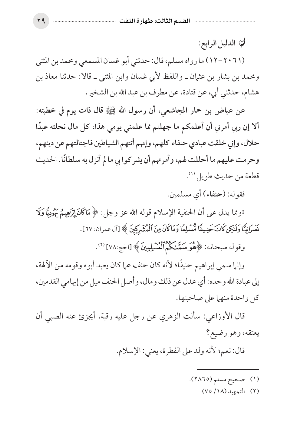 «ومما يدل على أن الحنفية الإسلام قوله الله عز وجل: (مَا كَانَ إِبْرَاهِيمُ يَهُودِيّاً وَلا نَصْرَانِيّاً وَلَكِن كَانَ حَنِيفاً مُّسْلِماً وَمَا كَانَ مِنَ الْمُشْرِكِينَ) [آل عمران: ٦٧].
