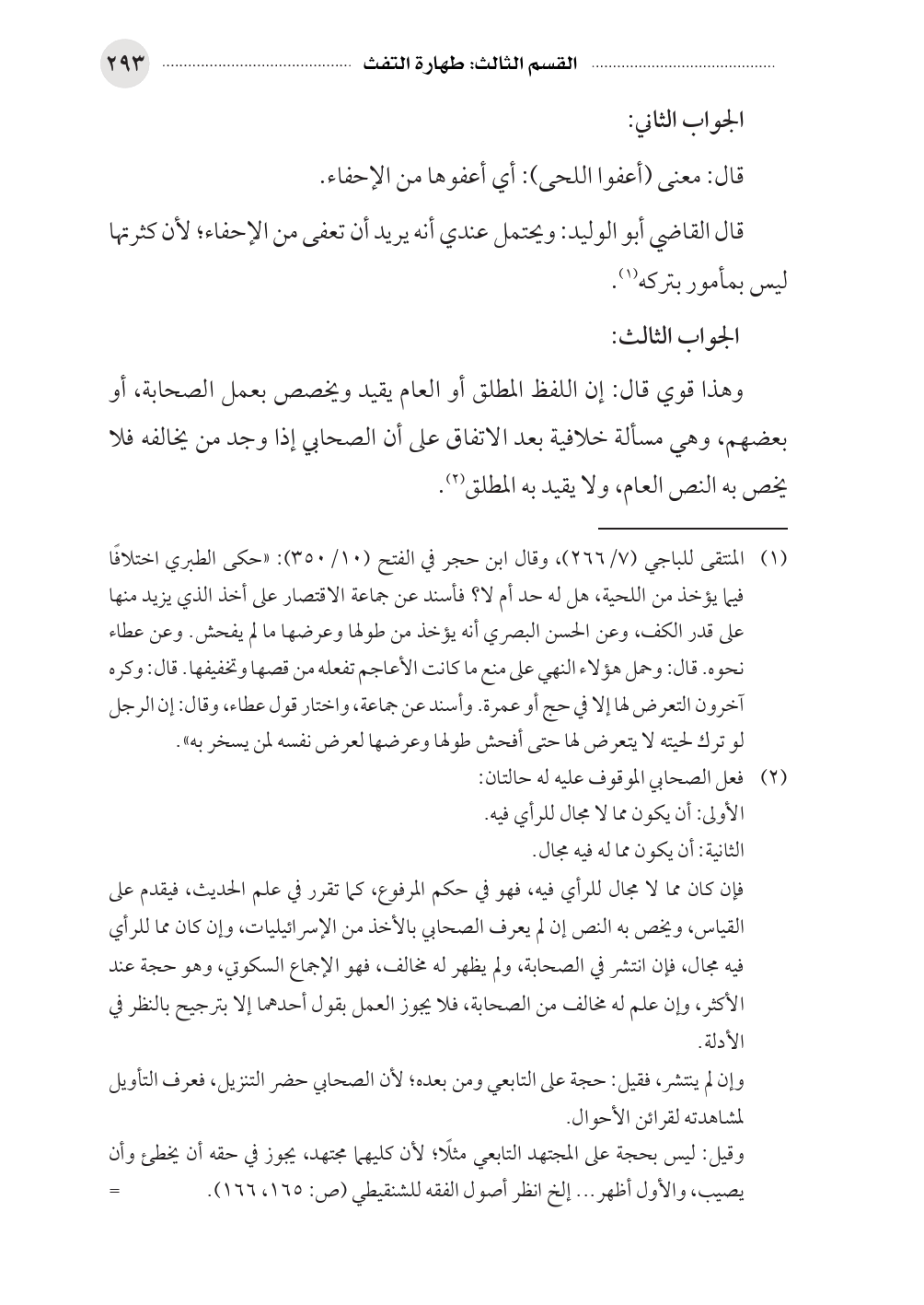 (¬١) المنتقى للباجي (٧/ ٢٦٦)، وقال ابن حجر في الفتح (١٠/ ٣٥٠): «حكى الطبري اختلافًا فيما يؤخذ من اللحية، هل له حد أم لا؟ فأسند عن جماعة الاقتصار على أخذ الذي يزيد منها على قدر الكف، وعن الحسن البصري أنه يؤخذ من طولها وعرضها ما لم يفحش. وعن عطاء نحوه. قال: وحمل هؤلاء النهي على منع ما كانت الأعاجم تفعله من قصها وتخفيفها. قال: وكره آخرون التعرض لها إلا في حج أو عمرة. وأسند عن جماعة، واختار قول عطاء، وقال: إن الرجل لو ترك لحيته لا يتعرض لها حتى أفحش طولها وعرضها لعرض نفسه لمن يسخر به».