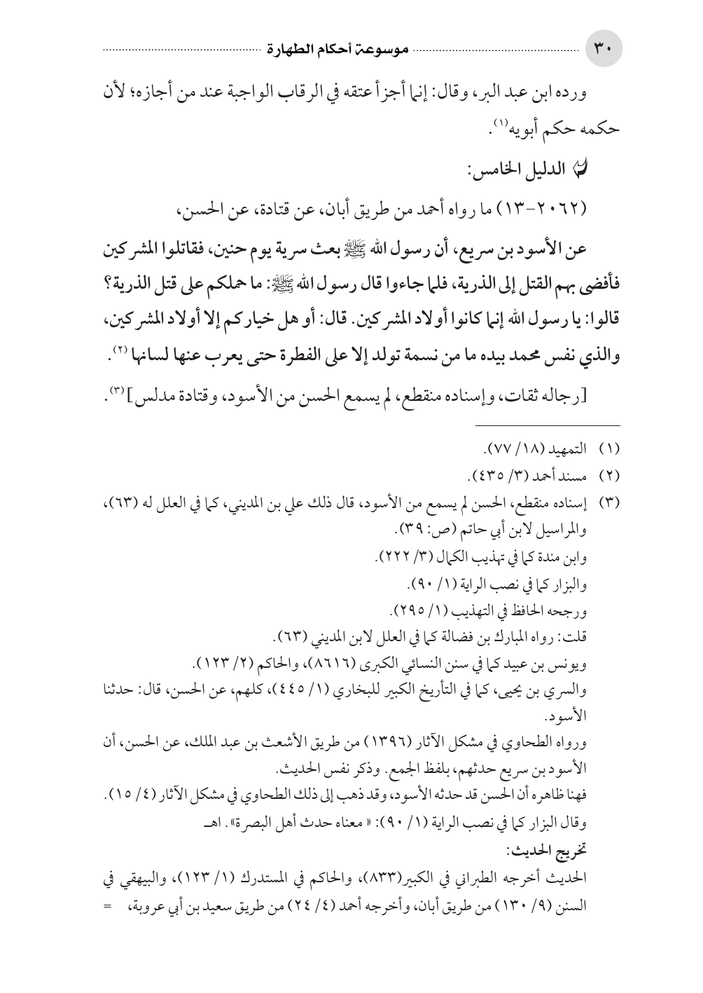 عن الأسود بن سريع، أن رسول الله صلى الله عليه وسلم بعث سرية يوم حنين، فقاتلوا المشركين فأفضى بهم القتل إلى الذرية، فلما جاءوا قال رسول الله صلى الله عليه وسلم: ما حملكم على قتل الذرية؟ قالوا: يا رسول الله إنما كانوا أولاد المشركين. قال: أو هل خياركم إلا أولاد المشركين، والذي نفس محمد بيده ما من نسمة تولد إلا على الفطرة حتى يعرب عنها لسانها (¬٢).
