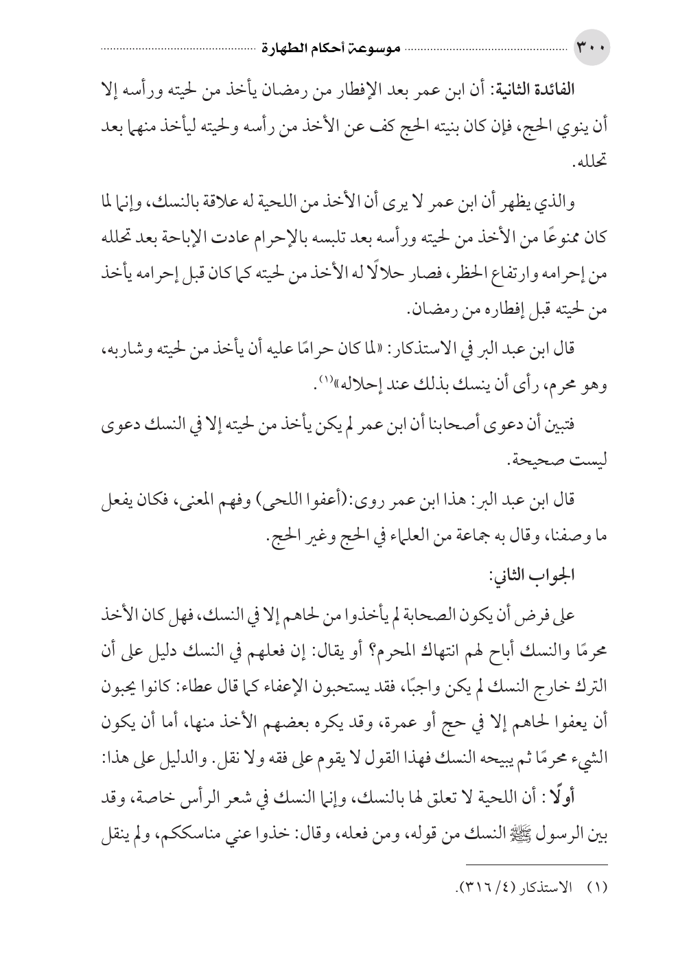 على فرض أن يكون الصحابة لم يأخذوا من لحاهم إلا في النسك، فهل كان الأخذ محرمًا والنسك أباح لهم انتهاك المحرم؟ أو يقال: إن فعلهم في النسك دليل على أن الترك خارج النسك لم يكن واجبًا، فقد يستحبون الإعفاء كما قال عطاء: كانوا يحبون أن يعفوا لحاهم إلا في حج أو عمرة، وقد يكره بعضهم الأخذ منها، أما أن يكون الشيء محرمًا ثم يبيحه النسك فهذا القول لا يقوم على فقه ولا نقل. والدليل على هذا: