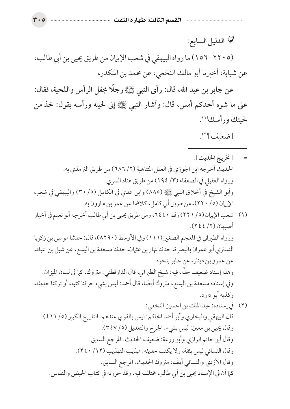 (٢٢٠٥ - ١٥٦) ما رواه البيهقي في شعب الإيمان من طريق يحيى بن أبي طالب، عن شبابة، أخبرنا أبو مالك النخعي، عن محمد بن المنكدر، عن جابر بن عبد الله، قال: رأى النبي صلى الله عليه وسلم رجلًا مجفل الرأس واللحية، فقال: على ما شوه أحدكم أمس، قال: وأشار النبي صلى الله عليه وسلم إلى لحيته ورأسه يقول: خذ من لحيتك ورأسك (¬١).