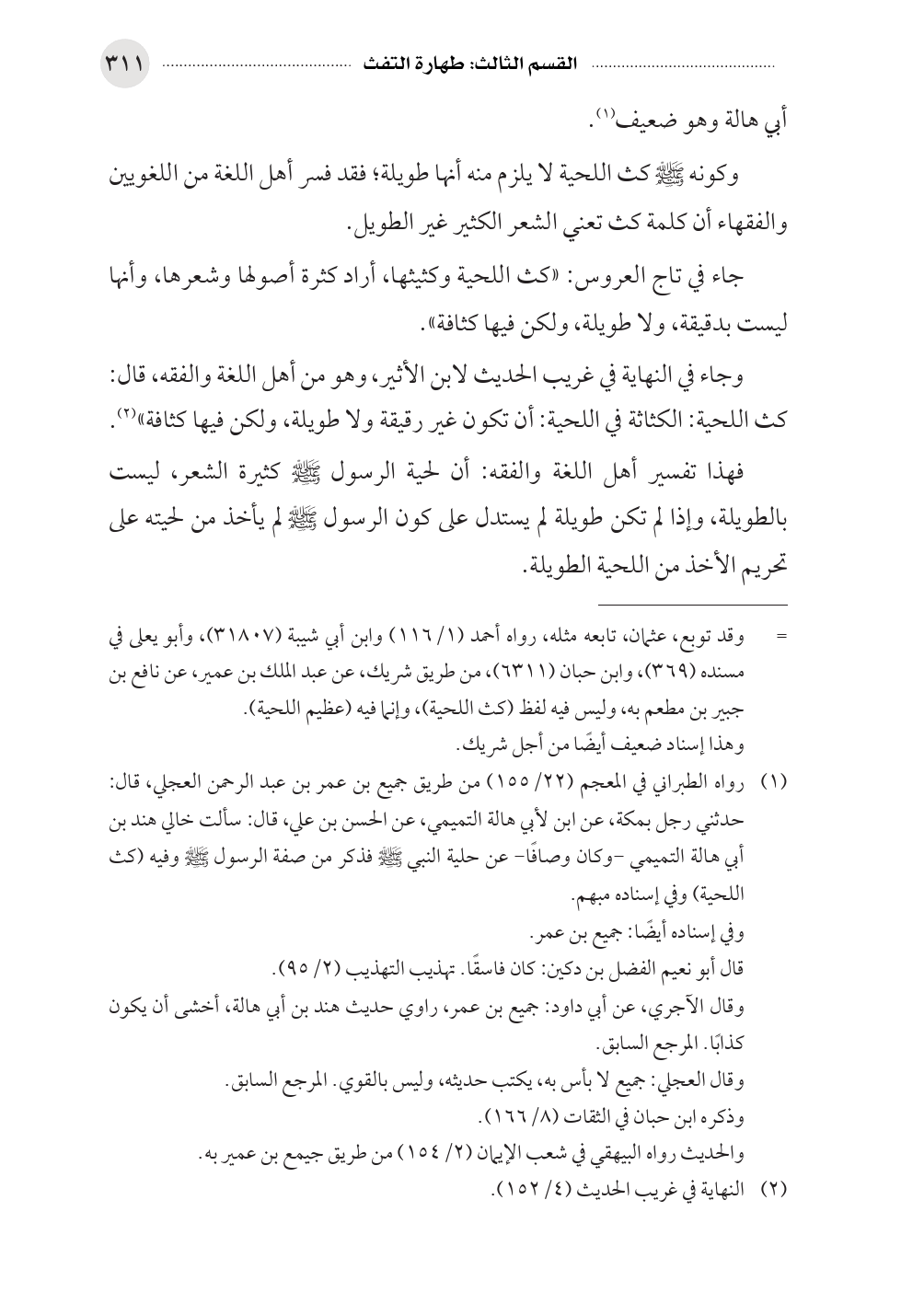 (¬١) رواه الطبراني في المعجم (٢٢/ ١٥٥) من طريق جميع بن عمر بن عبد الرحمن العجلي، قال: حدثني رجل بمكة، عن ابن لأبي هالة التميمي، عن الحسن بن علي، قال: سألت خالي هند بن أبي هالة التميمي -وكان وصافًا- عن حلية النبي صلى الله عليه وسلم فذكر من صفة الرسول صلى الله عليه وسلم وفيه (كث اللحية) وفي إسناده مبهم.