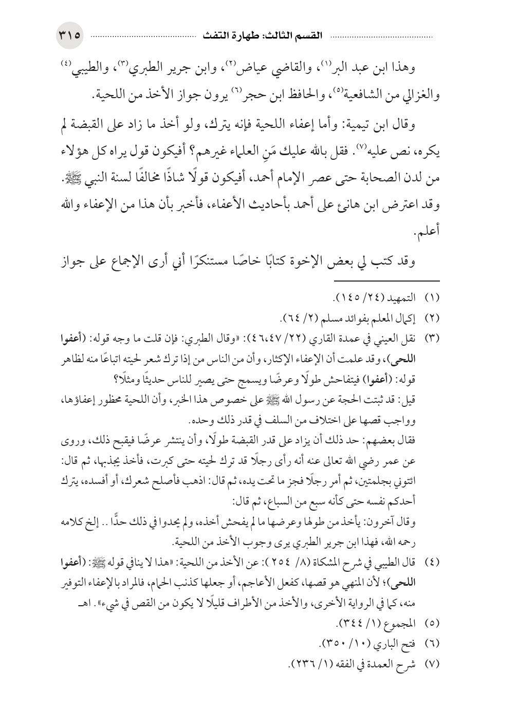 (¬٣) نقل العيني في عمدة القاري (٢٢/ ٤٦، ٤٧): «وقال الطبري: فإن قلت ما وجه قوله: (أعفوا اللحى)، وقد علمت أن الإعفاء الإكثار، وأن من الناس من إذا ترك شعر لحيته اتباعًا منه لظاهر قوله: (أعفوا) فيتفاحش طولًا وعرضًا ويسمج حتى يصير للناس حديثًا ومثلًا؟