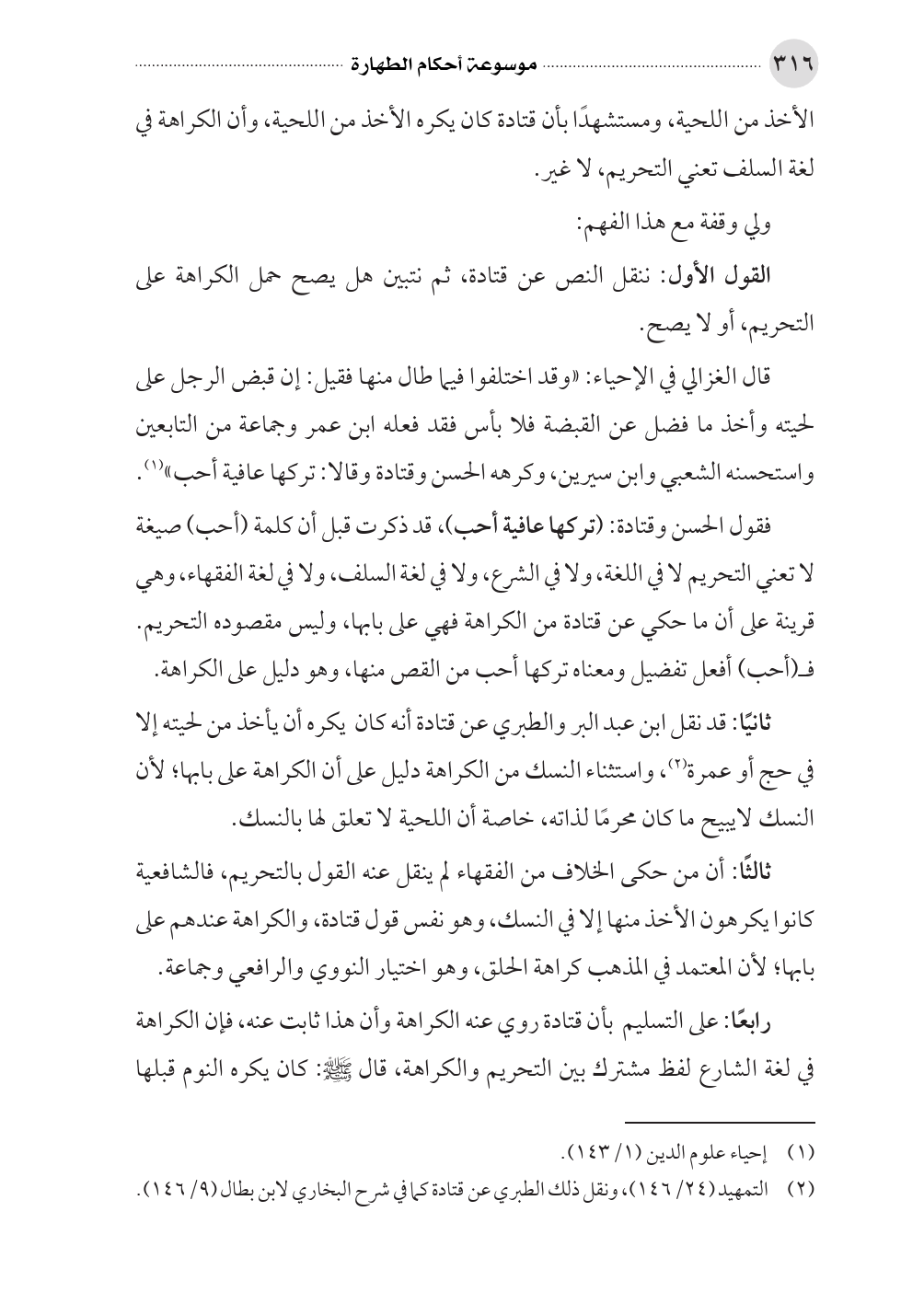 ثانيًا: قد نقل ابن عبد البر والطبري عن قتادة أنه كان يكره أن يأخذ من لحيته إلا في حج أو عمرة (¬٢)، واستثناء النسك من الكراهة دليل على أن الكراهة على بابها؛ لأن النسك لايبيح ما كان محرمًا لذاته، خاصة أن اللحية لا تعلق لها بالنسك.