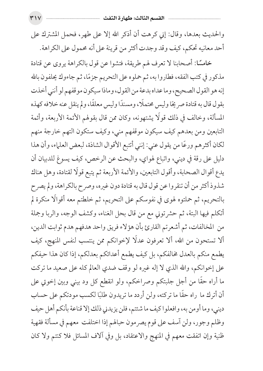 خامسًا: أصحابنا لا تعرف لهم طريقة، فتشوا عن قول بالكراهة يروى عن قتادة مذكور في كتب الفقه، فطاروا به، ثم حملوه على التحريم جزمًا، ثم جاءوك يحلفون بالله إنه هو القول الصحيح، وما عداه بدعة من القول، وماذا سيكون موقفهم لو أنني أخذت بقول قال به قتادة صريحًا وليس محتملًا، ومسندًا وليس معلقًا، ولم ينقل عنه خلافه كهذه المسألة، وخالف في ذلك قولًا يشتهونه، وكان ممن قال بقولهم الأئمة الأربعة، وأئمة التابعين ومن بعدهم كيف سيكون موقفهم مني، وكيف ستكون التهم خارجة منهم لكان أكثرهم ورعًا من يقول عني: إنني أتتبع الأقوال الشاذة، لبعض العلماء، وأن هذا دليل على رقة في ديني، واتباع لهواي، والبحث عن الرخص، كيف يسوغ للدبيان أن يدع أقوال الصحابة، وأقول التابعين، والأئمة الأربعة ثم يتبع قولًا لقتادة، وهل هناك شذوذ أكثر من أن تنقروا عن قول قال به قتادة دون غيره، وصرح بالكراهة، ولم يصرح بالتحريم، ثم حملتوه لهوى في نفوسكم على التحريم، ثم خلطتم معه أقوالًا منكرة لم أتكلم فيها البتة، ثم حشرتوني مع من قال بحل الغناء، وكشف الوجه، والربا وجملة من المخالفات، ثم أشعرتم القارئ بأن هؤلاء فريق واحد هدفهم هدم ثوابت الدين، ألا تستحون من الله، ألا تعرفون عدلًا لإخوانكم ممن ينتسب لنفس المنهج، كيف يطمع منكم بالعدل مخالفكم، بل كيف يطمع أعدائكم بعدلكم، إذا كان هذا حيفكم على إخوانكم، والله الذي لا إله غيره لو وقف ضدي العالم كله على صعيد ما تركت ما أراه حقًا من أجل جلبتكم وصراخكم، ولو انقطع كل ود بيني وبين إخوتي على أن أترك ما راه حقًا ما تركته، ولن أردد ما تريدون طلبًا لكسب مودتكم على حساب ديني، وما أومن به، وافعلوا كيف ما شئتم، فلن يزيدني ذلك إلا قناعة بأنكم أهل حيف وظلم وجور، ولن آسف على قوم يصرمون حبالهم إذا اختلفت معهم في مسألة فقهية ظنية وإن اتفقت معهم في المنهج والاعتقاد، بل وفي آلاف المسائل فلا كنتم ولا