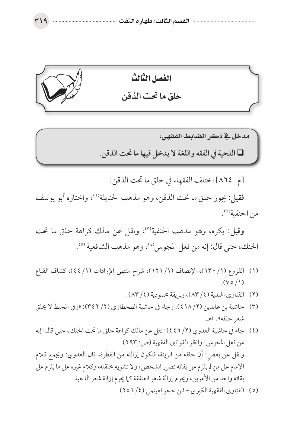 (¬٤) جاء في حاشية العدوي (٢/ ٤٤٦): نقل عن مالك كراهة حلق ما تحت الحنك، حتى قال: إنه من فعل المجوس. وانظر القوانين الفقهية (ص: ٢٩٣).