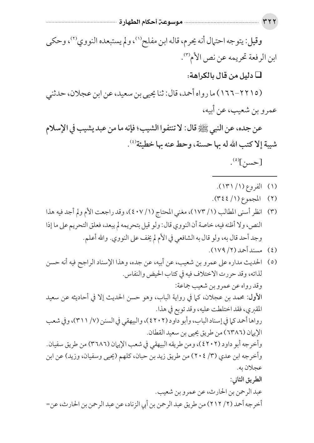 (¬٥) الحديث مداره على عمرو بن شعيب، عن أبيه، عن جده، وهذا الإسناد الراجح فيه أنه حسن لذاته، وقد حررت الاختلاف فيه في كتاب الحيض والنفاس.