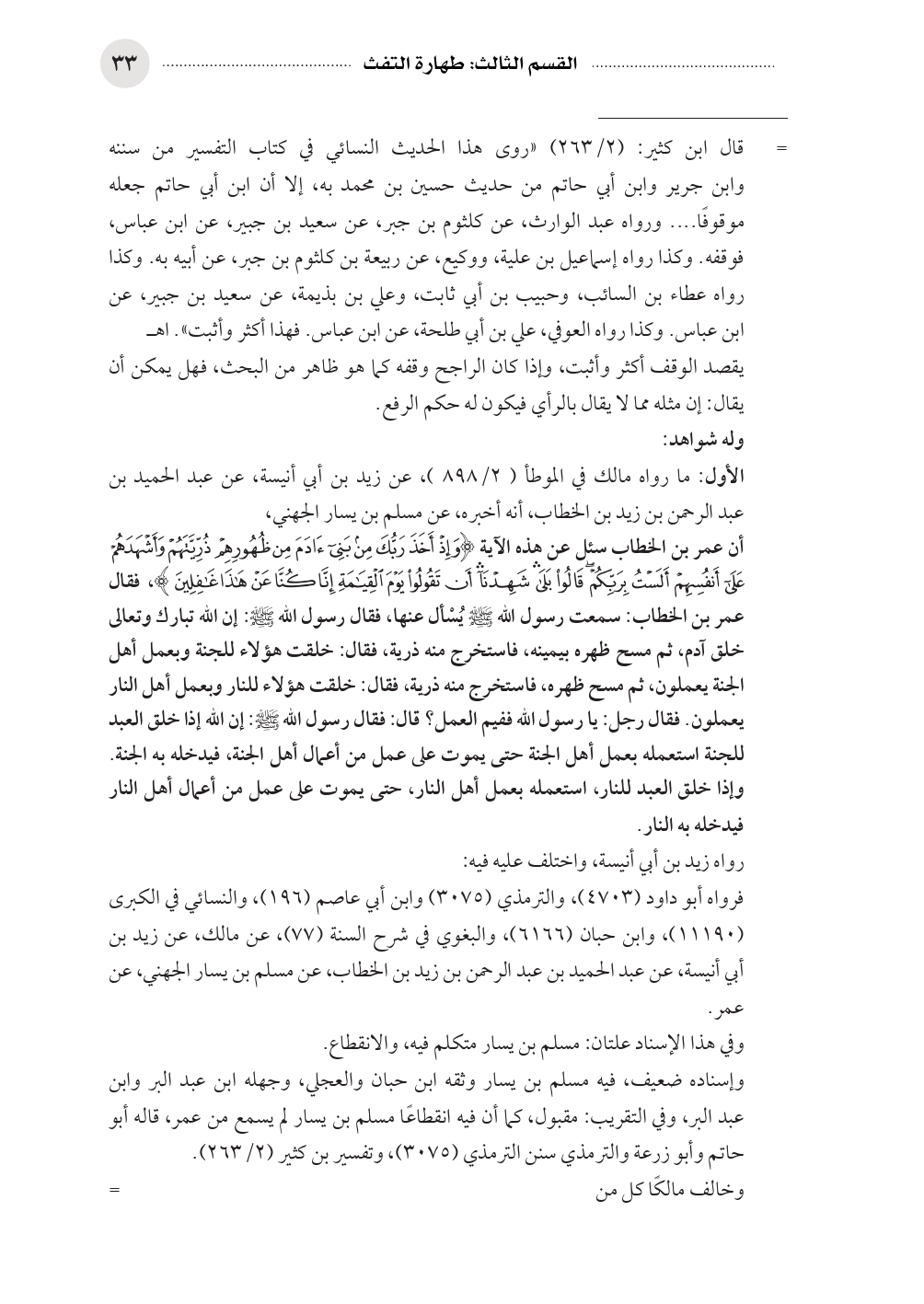 أن عمر بن الخطاب سئل عن هذه الآية (وَإِذْ أَخَذَ رَبُّكَ مِن بَنِي آدَمَ مِن ظُهُورِهِمْ ذُرِّيَّتَهُمْ وَأَشْهَدَهُمْ عَلَى أَنفُسِهِمْ أَلَسْتُ بِرَبِّكُمْ قَالُوا بَلَى شَهِدْنَا أَن تَقُولُوا يَوْمَ الْقِيَامَةِ إِنَّا كُنَّا عَنْ هَذَا غَافِلِينَ)، فقال عمر بن الخطاب: سمعت رسول الله صلى الله عليه وسلم يُسْأل عنها، فقال رسول الله صلى الله عليه وسلم: إن الله تبارك وتعالى خلق آدم، ثم مسح ظهره بيمينه، فاستخرج منه ذرية، فقال: خلقت هؤلاء للجنة وبعمل أهل الجنة يعملون، ثم مسح ظهره، فاستخرج منه ذرية، فقال: خلقت هؤلاء للنار وبعمل أهل النار يعملون. فقال رجل: يا رسول الله ففيم العمل؟ قال: فقال رسول الله صلى الله عليه وسلم: إن الله إذا خلق العبد للجنة استعمله بعمل أهل الجنة حتى يموت على عمل من أعمال أهل الجنة، فيدخله به الجنة. وإذا خلق العبد للنار، استعمله بعمل أهل النار، حتى يموت على عمل من أعمال أهل النار فيدخله به النار.