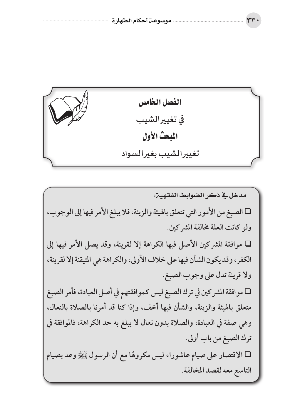 • موافقة المشركين الأصل فيها الكراهة إلا لقرينة، وقد يصل الأمر فيها إلى الكفر، وقد يكون الشأن فيها على خلاف الأولى، والكراهة هي المتيقنة إلا لقرينة، ولا قرينة تدل على وجوب الصبغ.