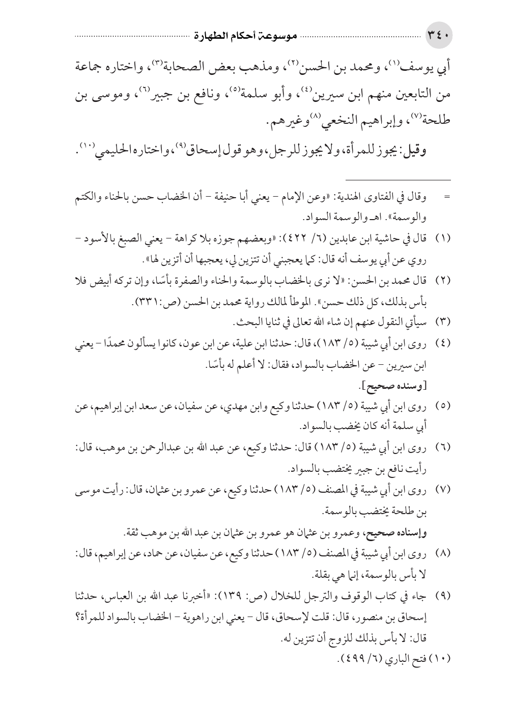 (¬٤) روى ابن أبي شيبة (٥/ ١٨٣)، قال: حدثنا ابن علية، عن ابن عون، كانوا يسألون محمدًا - يعني ابن سيرين - عن الخضاب بالسواد، فقال: لا أعلم له بأسًا.