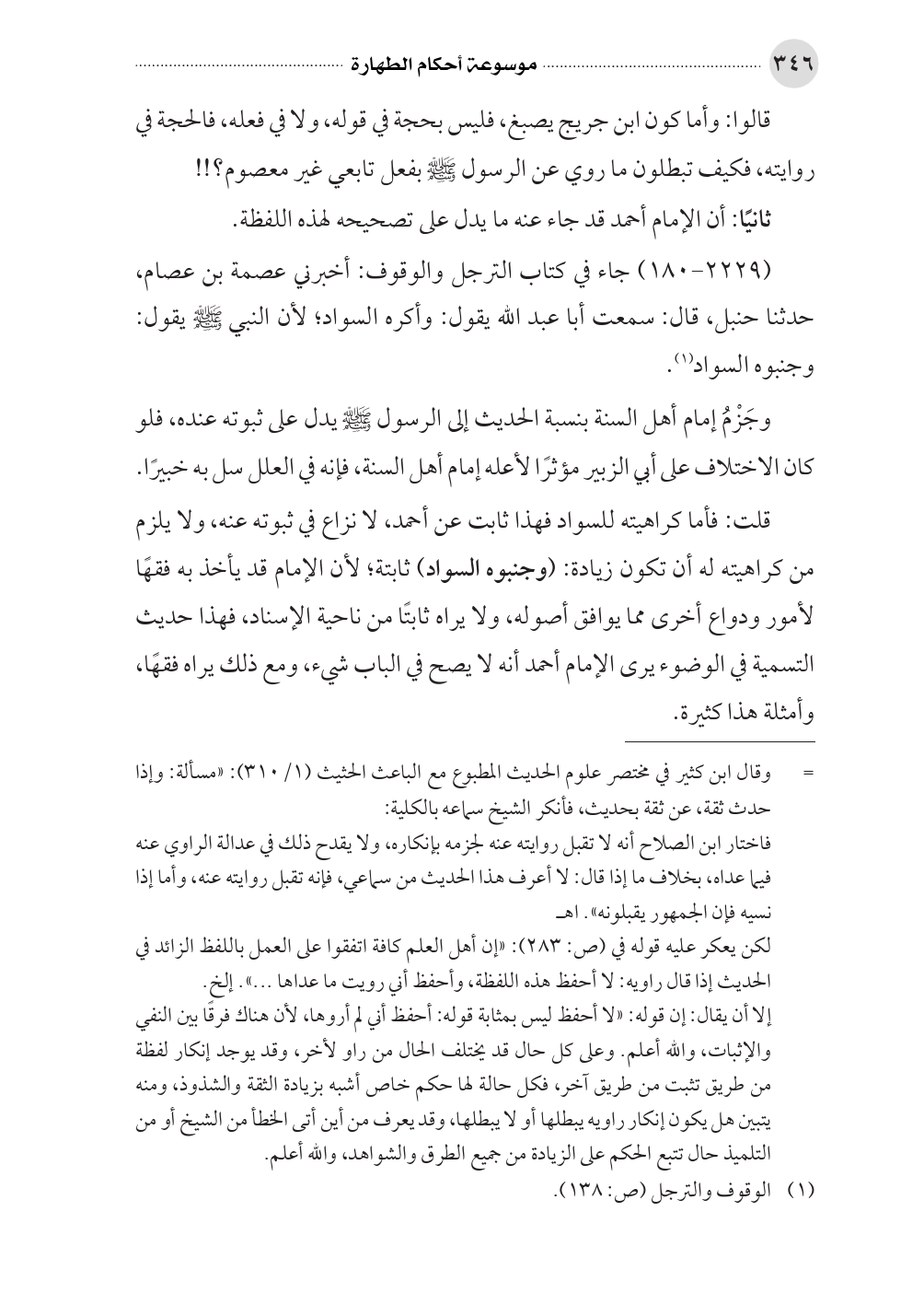 قلت: فأما كراهيته للسواد فهذا ثابت عن أحمد، لا نزاع في ثبوته عنه، ولا يلزم من كراهيته له أن تكون زيادة: (وجنبوه السواد) ثابتة؛ لأن الإمام قد يأخذ به فقهًا لأمور ودواع أخرى مما يوافق أصوله، ولا يراه ثابتًا من ناحية الإسناد، فهذا حديث التسمية في الوضوء يرى الإمام أحمد أنه لا يصح في الباب شيء، ومع ذلك يراه فقهًا، وأمثلة هذا كثيرة.