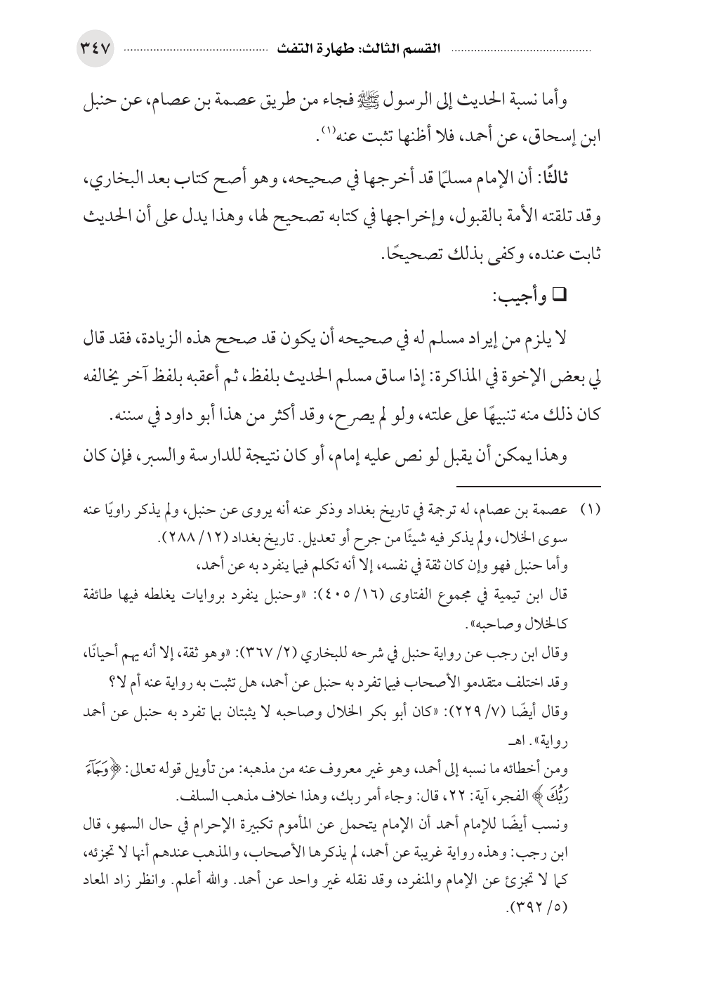 (¬١) عصمة بن عصام، له ترجمة في تاريخ بغداد وذكر عنه أنه يروى عن حنبل، ولم يذكر راويًا عنه سوى الخلال، ولم يذكر فيه شيئًا من جرح أو تعديل. تاريخ بغداد (١٢/ ٢٨٨).