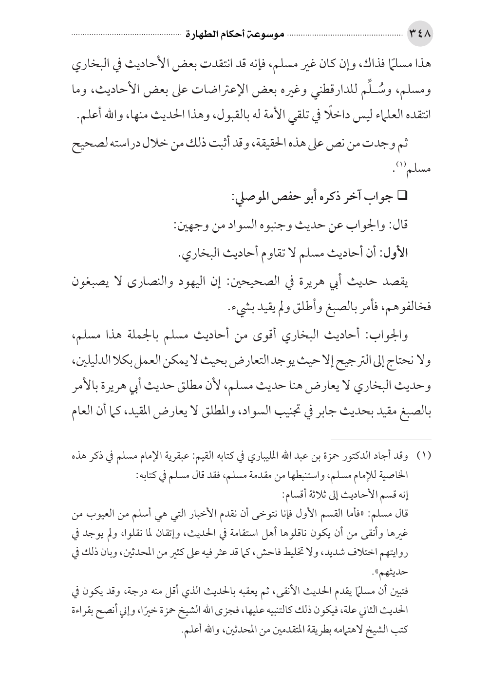 فتبين أن مسلمًا يقدم الحديث الأنقى، ثم يعقبه بالحديث الذي أقل منه درجة، وقد يكون في الحديث الثاني علة، فيكون ذلك كالتنبيه عليها، فجزى الله الشيخ حمزة خيرًا، وإني أنصح بقراءة كتب الشيخ لاهتمامه بطريقة المتقدمين من المحدثين، والله أعلم.