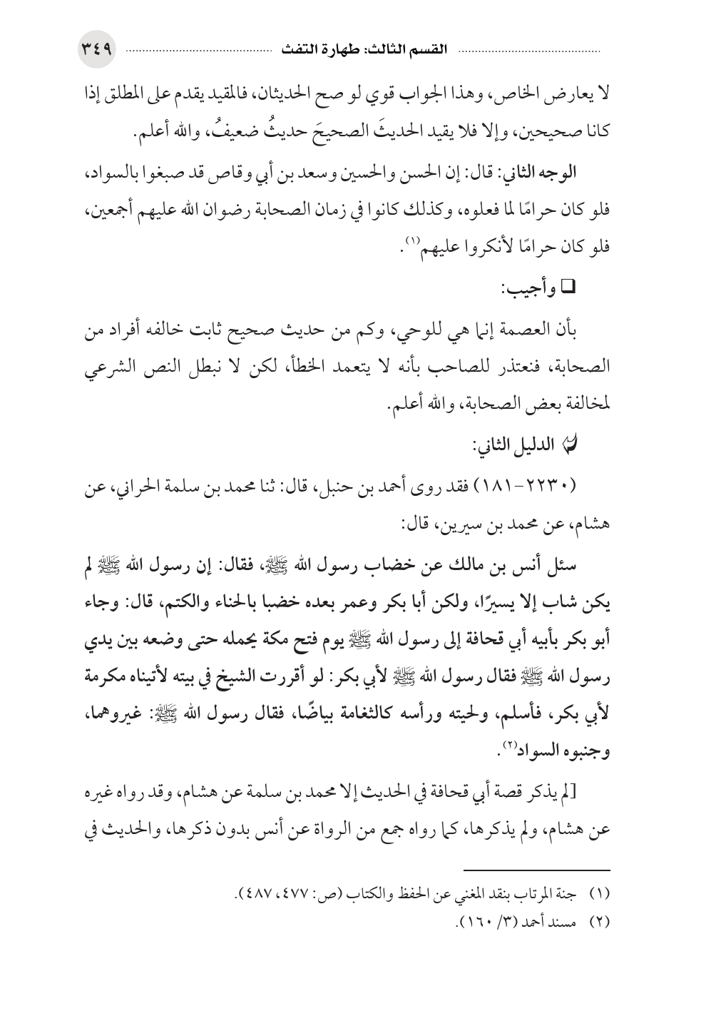 الوجه الثاني: قال: إن الحسن والحسين وسعد بن أبي وقاص قد صبغوا بالسواد، فلو كان حرامًا لما فعلوه، وكذلك كانوا في زمان الصحابة رضوان الله عليهم أجمعين، فلو كان حرامًا لأنكروا عليهم (¬١).