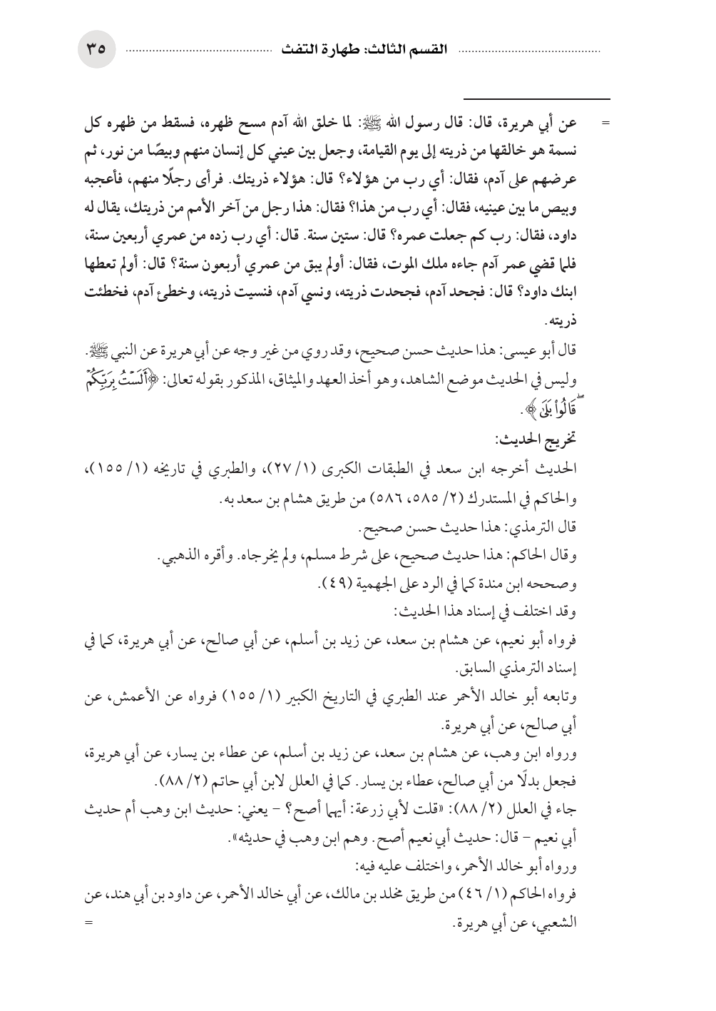 = عن أبي هريرة، قال: قال رسول الله صلى الله عليه وسلم: لما خلق الله آدم مسح ظهره، فسقط من ظهره كل نسمة هو خالقها من ذريته إلى يوم القيامة، وجعل بين عيني كل إنسان منهم وبيصًا من نور، ثم عرضهم على آدم، فقال: أي رب من هؤلاء؟ قال: هؤلاء ذريتك. فرأى رجلًا منهم، فأعجبه وبيص ما بين عينيه، فقال: أي رب من هذا؟ فقال: هذا رجل من آخر الأمم من ذريتك، يقال له داود، فقال: رب كم جعلت عمره؟ قال: ستين سنة. قال: أي رب زده من عمري أربعين سنة، فلما قضي عمر آدم جاءه ملك الموت، فقال: أولم يبق من عمري أربعون سنة؟ قال: أولم تعطها ابنك داود؟ قال: فجحد آدم، فجحدت ذريته، ونسي آدم، فنسيت ذريته، وخطئ آدم، فخطئت ذريته.