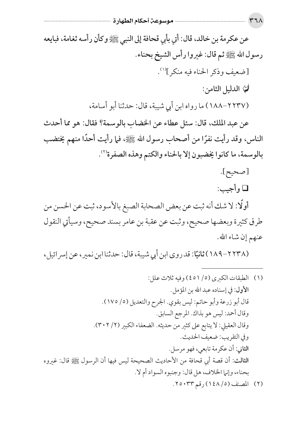 الثالث: أن قصة أبي قحافة من الأحاديث الصحيحة ليس فيها أن الرسول صلى الله عليه وسلم قال: غيروه بحناء، وإنما الخلاف، هل قال: وجنبوه السواد أم لا.