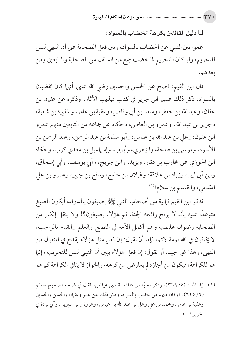 (¬١) زاد المعاد (٤/ ٣٦٩)، وذكر نحوًا من ذلك القاضي عياض، فقال في شرحه لصحيح مسلم (٦/ ٦٢٥): «وكان منهم من يخضب بالسواد، وذكر ذلك عن عمر وعثمان والحسن والحسين وعقبة بن عامر، ومحمد بن علي وعلي بن عبد الله بن عباس، وعروة وابن سيرين، وأبي بردة في آخرين». اهـ