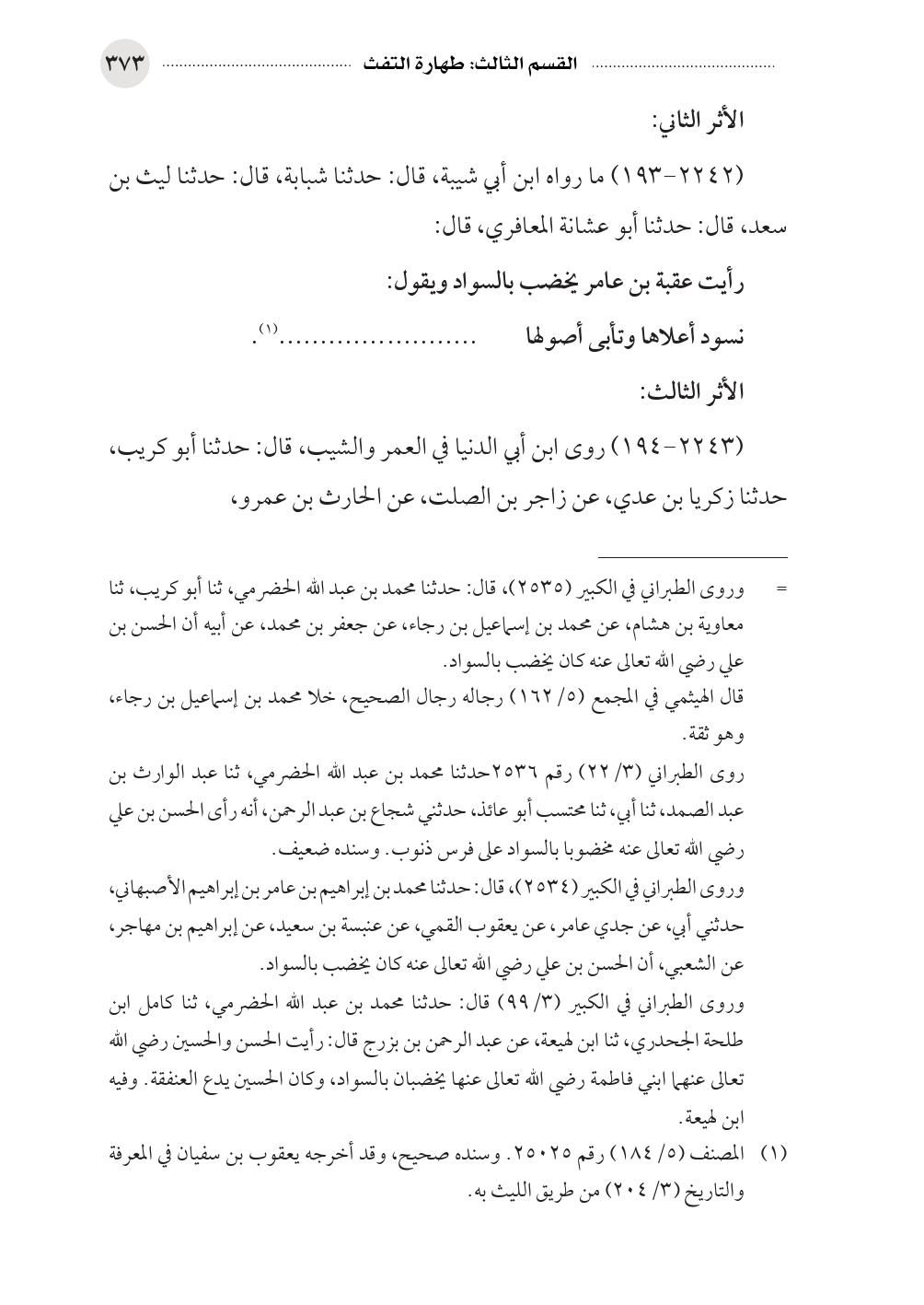 وروى الطبراني في الكبير (٣/ ٩٩) قال: حدثنا محمد بن عبد الله الحضرمي، ثنا كامل ابن طلحة الجحدري، ثنا ابن لهيعة، عن عبد الرحمن بن بزرج قال: رأيت الحسن والحسين رضي الله تعالى عنهما ابني فاطمة رضي الله تعالى عنها يخضبان بالسواد، وكان الحسين يدع العنفقة. وفيه ابن لهيعة.