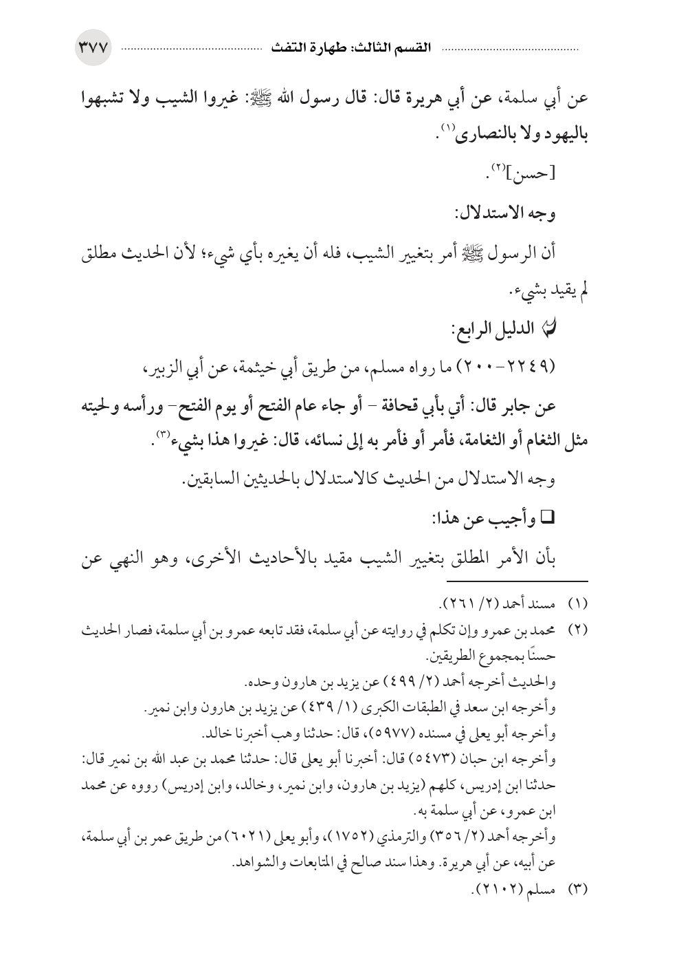 (٢٢٤٩ - ٢٠٠) ما رواه مسلم، من طريق أبي خيثمة، عن أبي الزبير، عن جابر قال: أتي بأبي قحافة - أو جاء عام الفتح أو يوم الفتح- ورأسه ولحيته مثل الثغام أو الثغامة، فأمر أو فأمر به إلى نسائه، قال: غيروا هذا بشيء (¬٣).