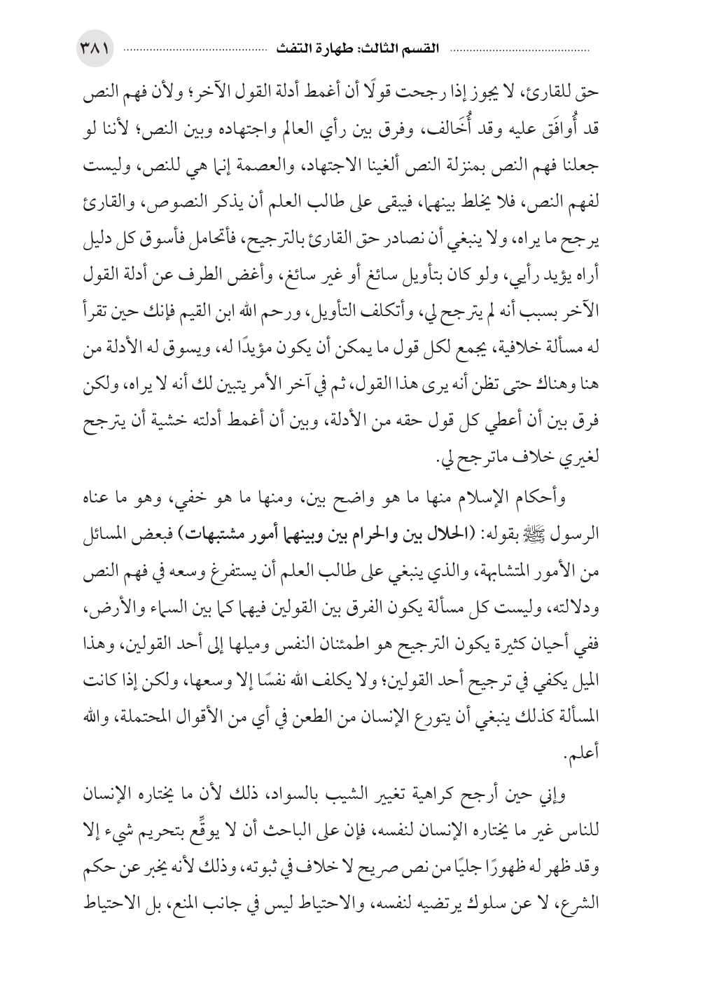 وإني حين أرجح كراهية تغيير الشيب بالسواد، ذلك لأن ما يختاره الإنسان للناس غير ما يختاره الإنسان لنفسه، فإن على الباحث أن لا يوقِّع بتحريم شيء إلا وقد ظهر له ظهورًا جليًا من نص صريح لا خلاف في ثبوته، وذلك لأنه يخبر عن حكم الشرع، لا عن سلوك يرتضيه لنفسه، والاحتياط ليس في جانب المنع، بل الاحتياط