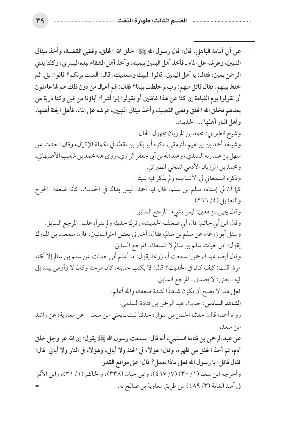= عن أبي أمامة الباهلي، قال: قال رسول الله صلى الله عليه وسلم: خلق الله الخلق، وقضى القضية، وأخذ ميثاق النبيين، وعرشه على الماء ـ فأخذ أهل اليمين بيمينه، وأخذ أهل الشقاء بيده اليسرى، وكلتا يدي الرحمن يمين، فقال: يا أهل اليمين. قالوا: لبيك وسعديك. قال: ألست بربكم؟ قالوا: بلى. ثم خلط بينهم. فقال قائل منهم: رب لم خلطت بيننا؟ فقال: لهم أعمال من دون ذلك هم لها عاملون أن تقولوا يوم القيامة إن كنا عن هذا غافلين أو تقولوا إنما أشرك آباؤنا من قبل وكنا ذرية من بعدهم فخلق الله الخلق وقضى القضية، وأخذ ميثاق النبيين، عرشه على الماء، فأهل الجنة أهلها، وأهل النار أهلها ... الحديث.