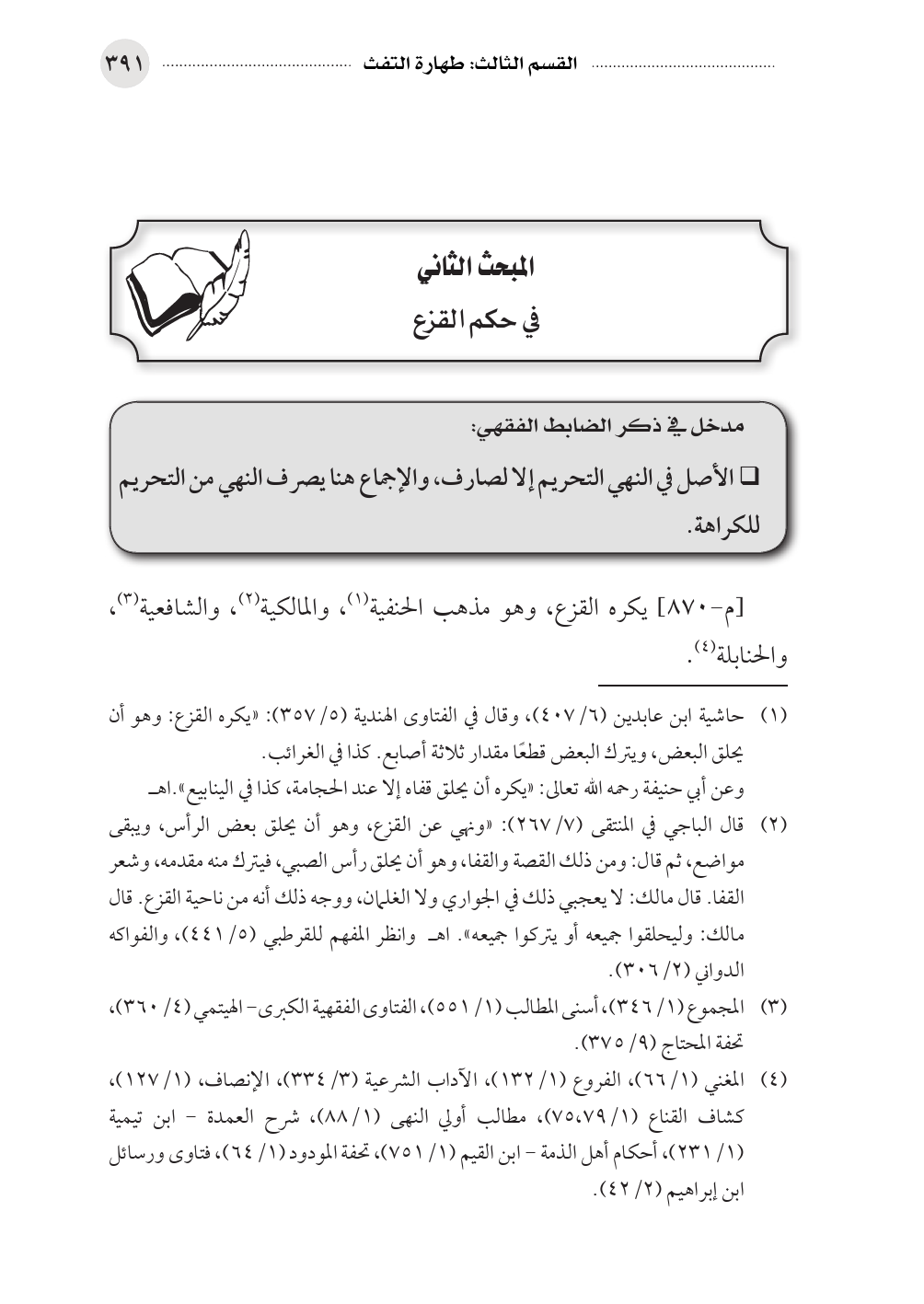 (¬١) حاشية ابن عابدين (٦/ ٤٠٧)، وقال في الفتاوى الهندية (٥/ ٣٥٧): «يكره القزع: وهو أن يحلق البعض، ويترك البعض قطعًا مقدار ثلاثة أصابع. كذا في الغرائب.
