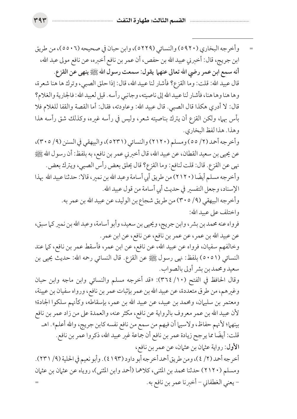 وقال الحافظ في الفتح (١٠/ ٣٦٤): «قد أخرجه مسلم والنسائي وابن ماجه وابن حبان وغيرهم، من طرق متعددة، عن عبيد الله بن عمر بإثبات عمر بن نافع، ورواه سفيان بن عيينة، ومعتمر بن سليمان، ومحمد بن عبيد، عن عبيد الله بن عمر، بإسقاطه، وكأنهم سلكوا الجادة؛ لأن عبيد الله بن عمر معروف بالرواية عن نافع، مكثر عنه، والعمدة على من زاد عمر بن نافع بينهما؛ لأنهم حفاظ، ولاسيما أن فيهم من سمع من نافع نفسه كابن جريج، والله أعلم». اهـ