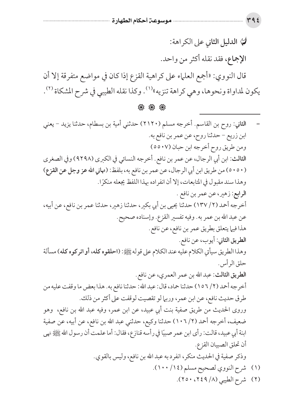 قال النووي: «أجمع العلماء على كراهية القزع إذا كان في مواضع متفرقة إلا أن يكون لمداواة ونحوها، وهي كراهة تنزيه» (¬١). وكذا نقله الطيبي في شرح المشكاة (¬٢).
