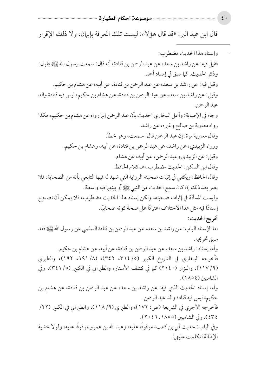 وأما إسناد الحديث الذي فيه: عن راشد بن سعد، عن عبد الرحمن بن قتادة، عن هشام بن حكيم، ليس فيه قتادة والد عبد الرحمن.