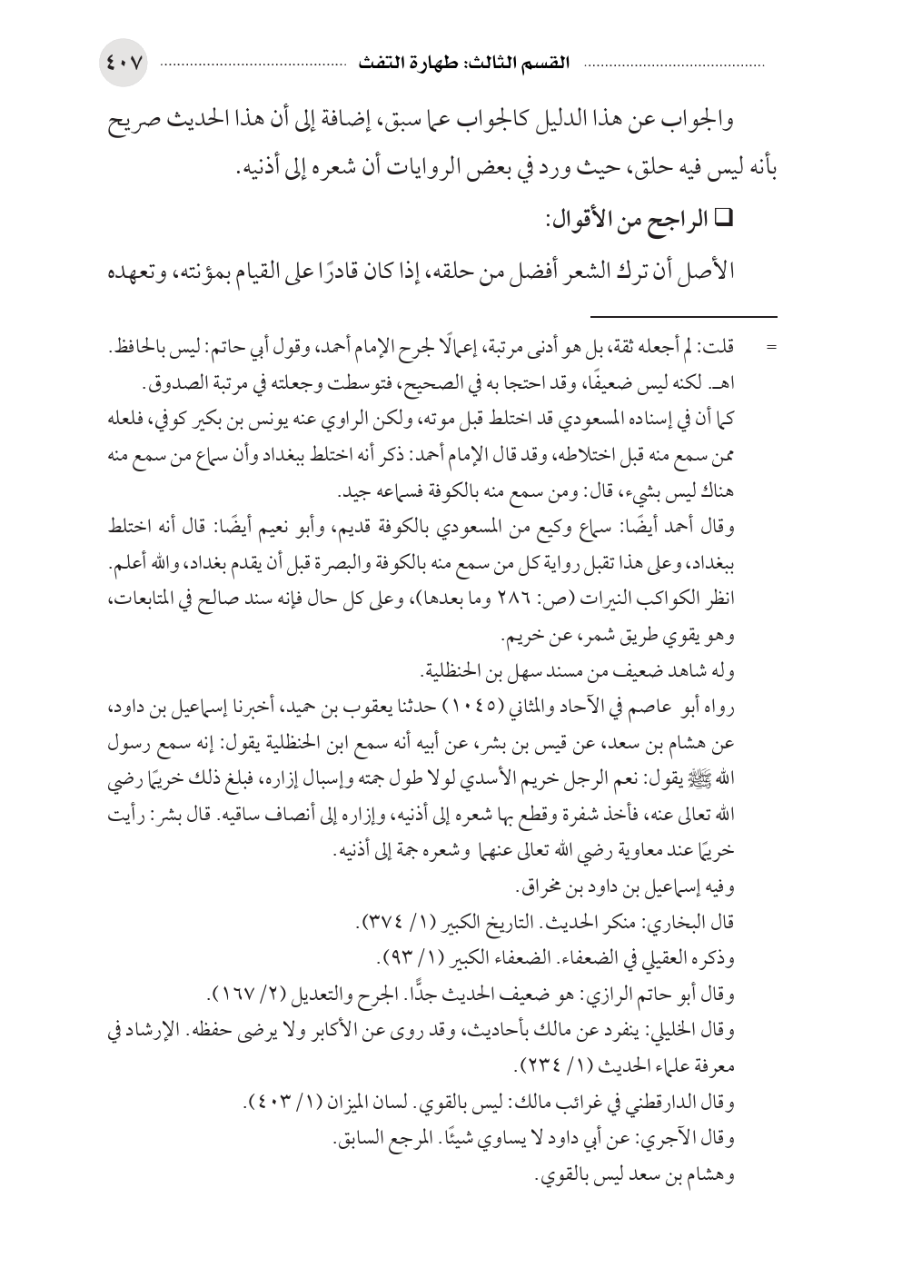 والجواب عن هذا الدليل كالجواب عما سبق، إضافة إلى أن هذا الحديث صريح بأنه ليس فيه حلق، حيث ورد في بعض الروايات أن شعره إلى أذنيه.