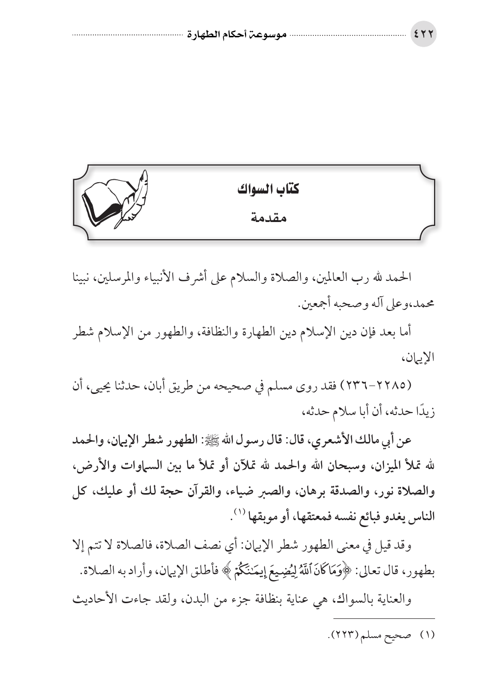 عن أبي مالك الأشعري، قال: قال رسول الله صلى الله عليه وسلم: الطهور شطر الإيمان، والحمد لله تملأ الميزان، وسبحان الله والحمد لله تملآن أو تملأ ما بين السماوات والأرض، والصلاة نور، والصدقة برهان، والصبر ضياء، والقرآن حجة لك أو عليك، كل الناس يغدو فبائع نفسه فمعتقها، أو موبقها (¬١).
