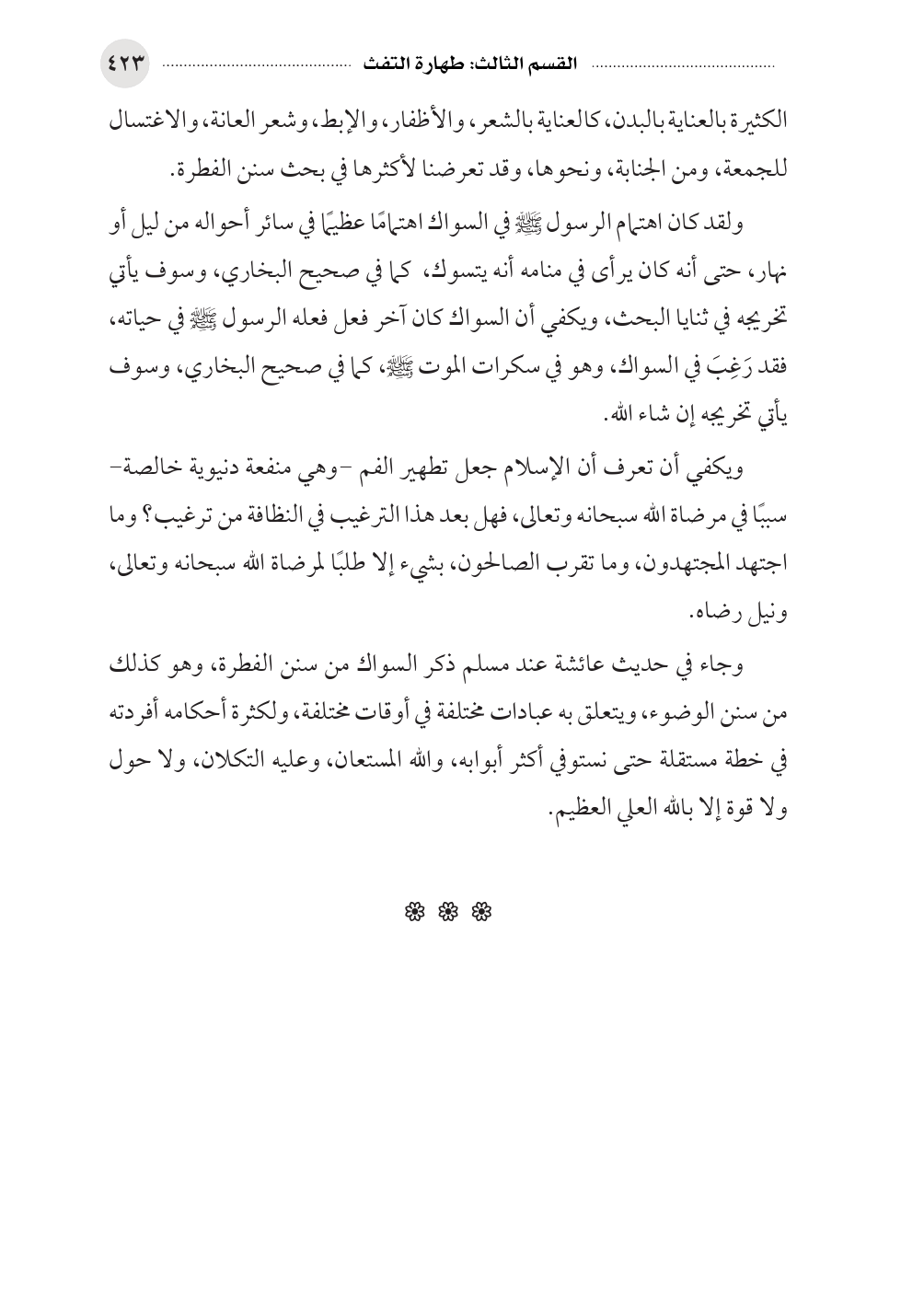 ويكفي أن تعرف أن الإسلام جعل تطهير الفم -وهي منفعة دنيوية خالصة- سببًا في مرضاة الله سبحانه وتعالى، فهل بعد هذا الترغيب في النظافة من ترغيب؟ وما اجتهد المجتهدون، وما تقرب الصالحون، بشيء إلا طلبًا لمرضاة الله سبحانه وتعالى، ونيل رضاه.