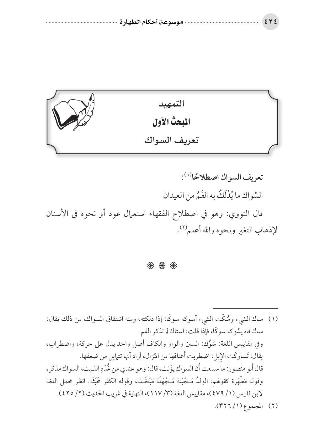 قال النووي: وهو في اصطلاح الفقهاء استعمال عود أو نحوه في الأسنان لإذهاب التغير ونحوه والله أعلم (¬٢).