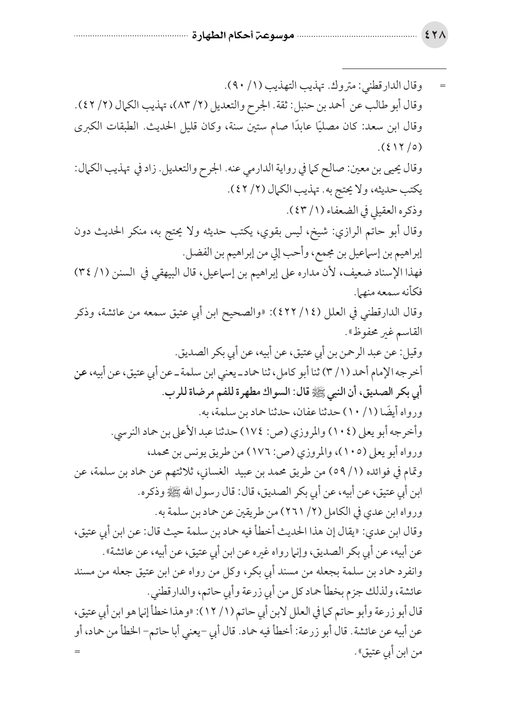 قال أبو زرعة وأبو حاتم كما في العلل لابن أبي حاتم (١/ ١٢): «وهذا خطأ إنما هو ابن أبي عتيق، عن أبيه عن عائشة. قال أبو زرعة: أخطأ فيه حماد. قال أبي -يعني أبا حاتم- الخطأ من حماد، أو من ابن أبي عتيق». =