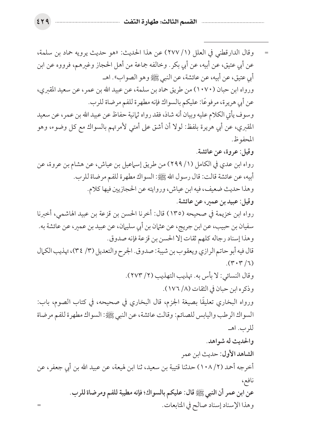 ورواه ابن حبان (١٠٧٠) من طريق حماد بن سلمة، عن عبيد الله بن عمر، عن سعيد المقبري، عن أبي هريرة، مرفوعًا: عليكم بالسواك فإنه مطهرة للفم مرضاة للرب.