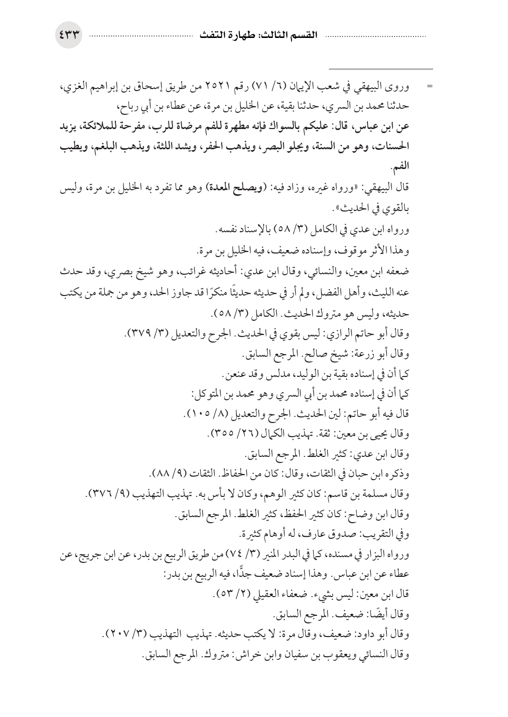قال البيهقي: «ورواه غيره، وزاد فيه: (ويصلح المعدة) وهو مما تفرد به الخليل بن مرة، وليس بالقوي في الحديث».