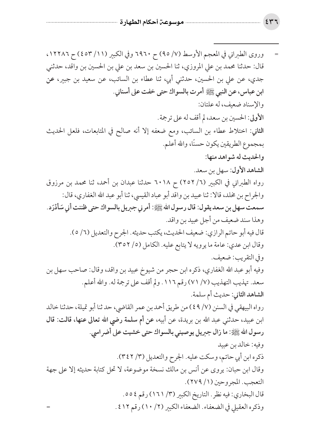 ابن عباس، عن النبي صلى الله عليه وسلم أمرت بالسواك حتى خفت على أسناني.