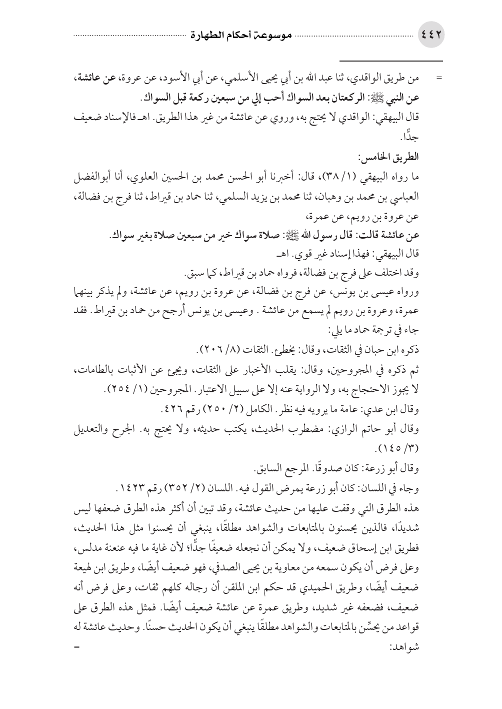 = من طريق الواقدي، ثنا عبد الله بن أبي يحيى الأسلمي، عن أبي الأسود، عن عروة، عن عائشة، عن النبي صلى الله عليه وسلم: الركعتان بعد السواك أحب إلي من سبعين ركعة قبل السواك.