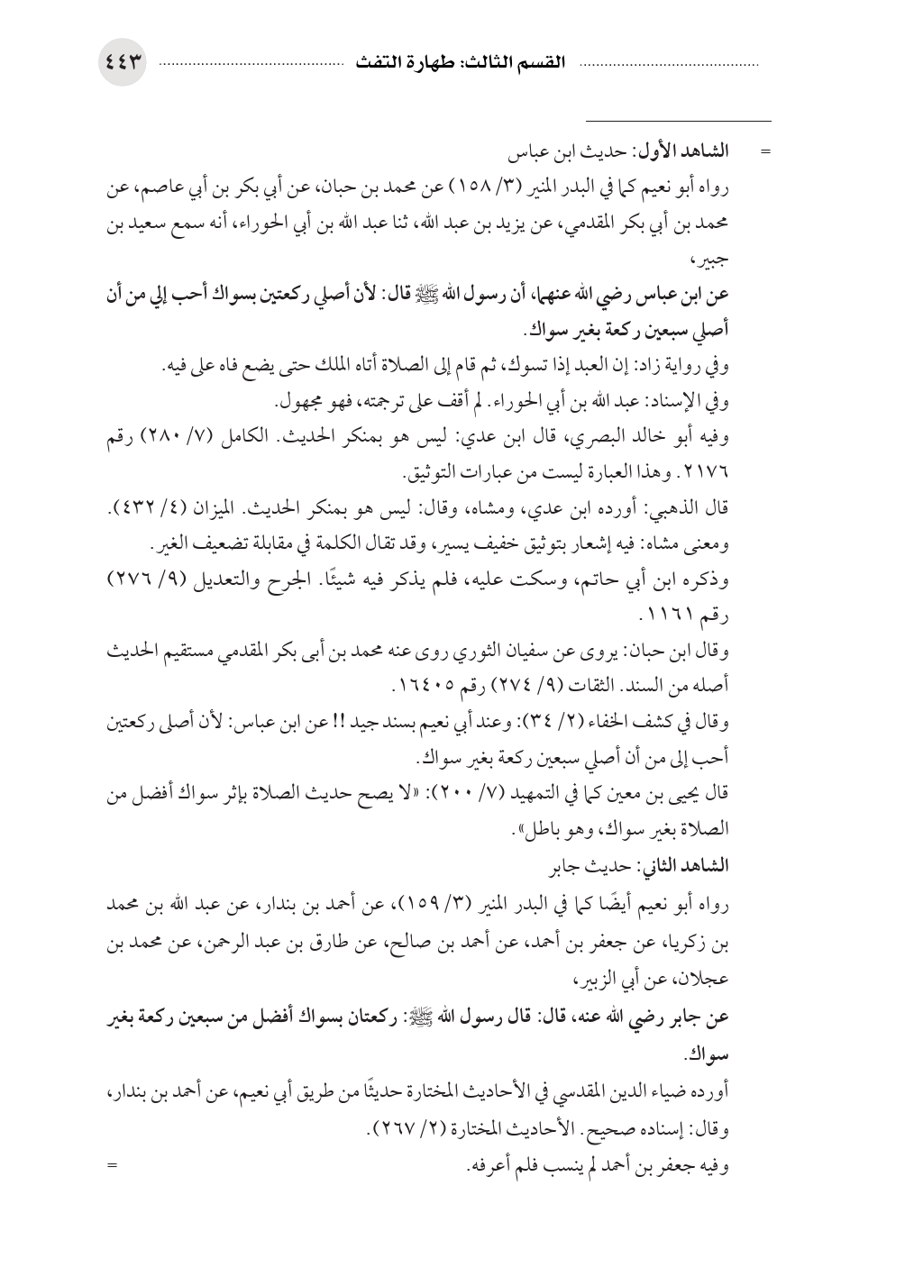 وقال في كشف الخفاء (٢/ ٣٤): وعند أبي نعيم بسند جيد! ! عن ابن عباس: لأن أصلى ركعتين أحب إلى من أن أصلي سبعين ركعة بغير سواك.