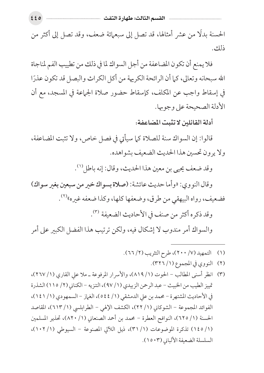 وقال النووي: «وأما حديث عائشة: (صلاة بسواك خير من سبعين بغير سواك) فضعيف، رواه البيهقي من طرق، وضعفها كلها، وكذا ضعفه غيره» (¬٢).