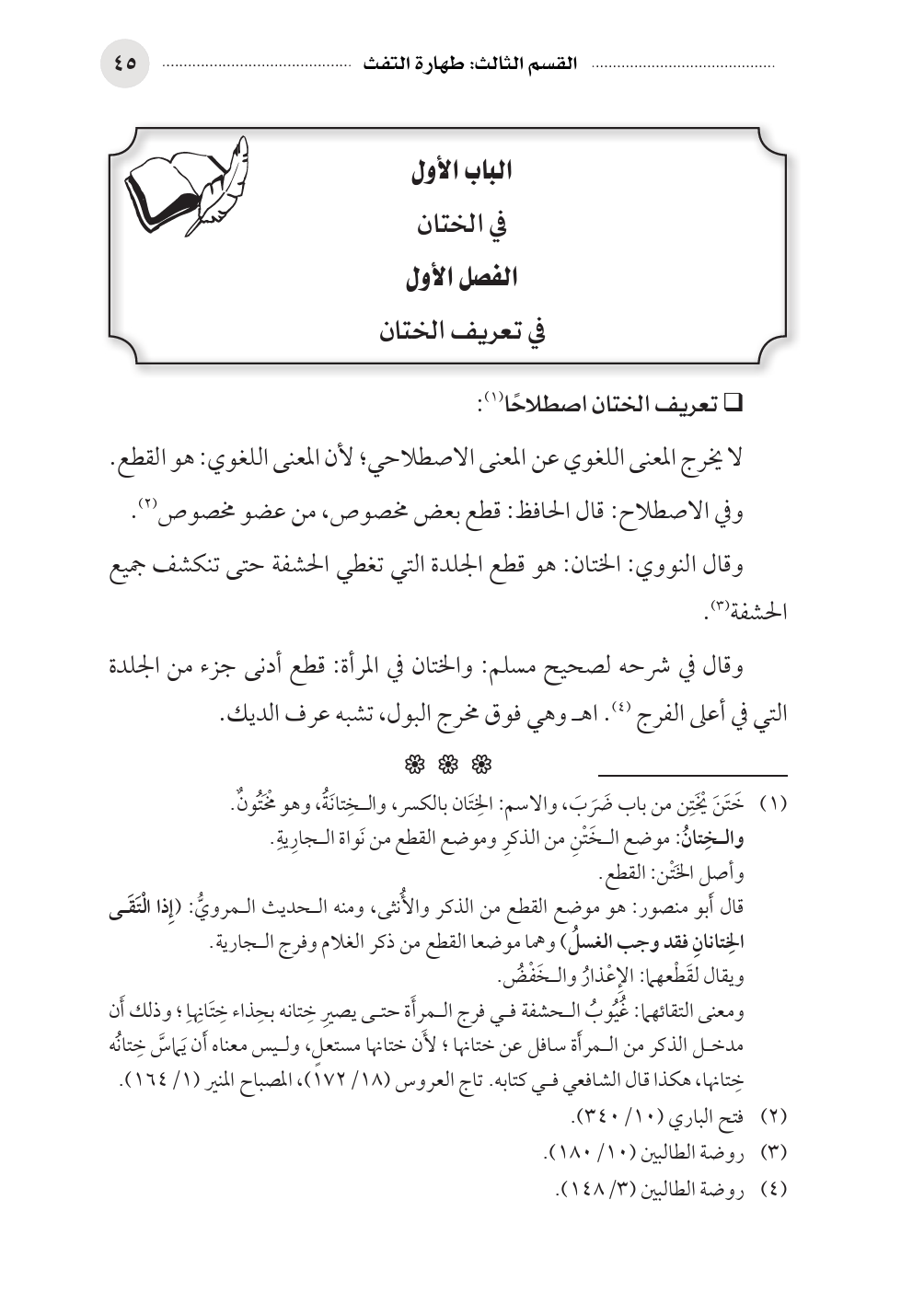 وقال النووي: الختان: هو قطع الجلدة التي تغطي الحشفة حتى تنكشف جميع الحشفة (¬٣).
