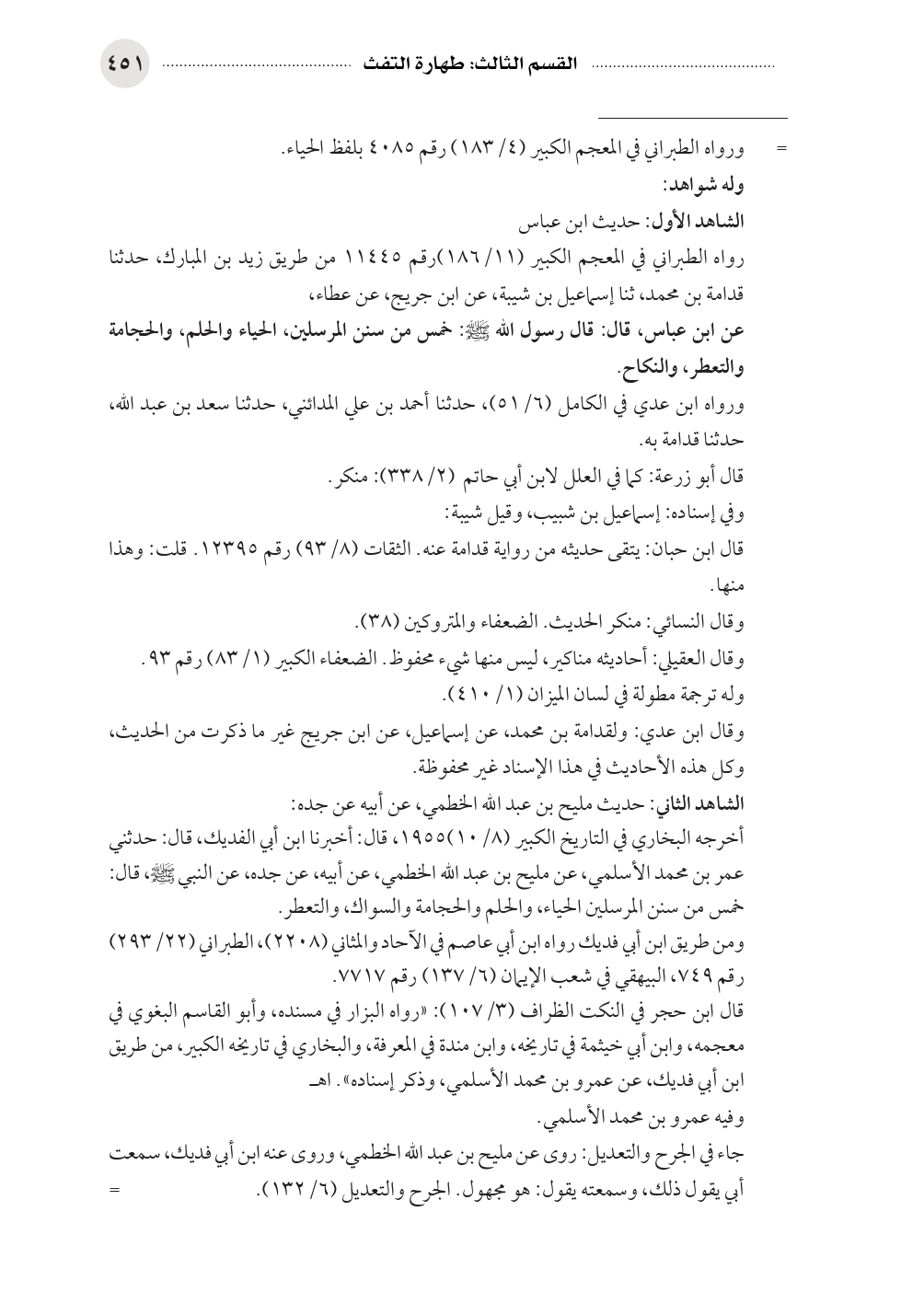 أخرجه البخاري في التاريخ الكبير (٨/ ١٠) ١٩٥٥، قال: أخبرنا ابن أبي الفديك، قال: حدثني عمر بن محمد الأسلمي، عن مليح بن عبد الله الخطمي، عن أبيه، عن جده، عن النبي صلى الله عليه وسلم، قال: خمس من سنن المرسلين الحياء، والحلم والحجامة والسواك، والتعطر.