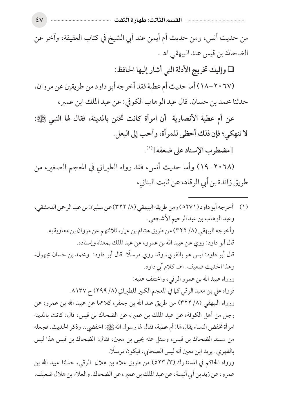 (٢٠٦٧ - ١٨) أما حديث أم عطية فقد أخرجه أبو داود من طريقين عن مروان، حدثنا محمد بن حسان. قال عبد الوهاب الكوفي: عن عبد الملك ابن عمير،