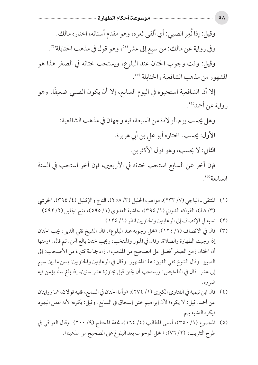 (¬٤) قال ابن تيمية في الفتاوى الكبرى (١/ ٢٧٤): «وأما الختان في السابع، ففيه قولان، هما روايتان عن أحمد. قيل: لا يكره؛ لأن إبراهيم ختن إسحاق في السابع. وقيل: يكره؛ لأنه عمل اليهود فيكره التشبه بهم.